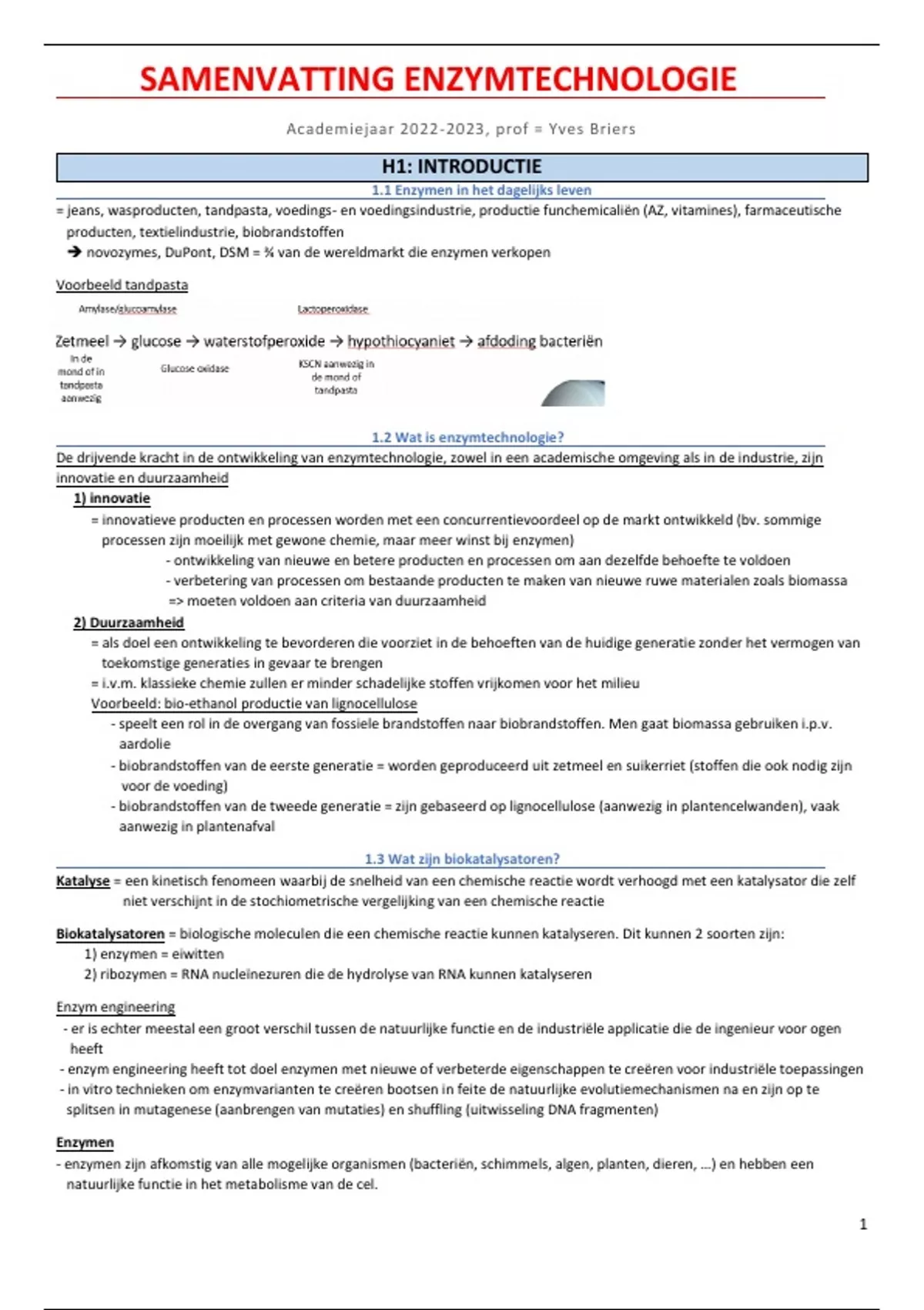 Dit document bevat een uitgebreide samenvatting van het vak enzymtechnologie gegeven door prof. Yves Briers. Deze samenvatting is een combinatie van zijn cursus en slides en was het enige dat ik echt studeerde met steeds een goed resultaat als gevolg. Deze samenvatting bevat volgende hoofdstukken: Introductie, Enzymkatalyse, Enzymkinetiek, Enzyminhibitie- en activatie, Bepaling specifieke activiteit, Industriële productie van enzymen, Immobilisatie en biosensoren en toepassingen in de biomedische sector.
