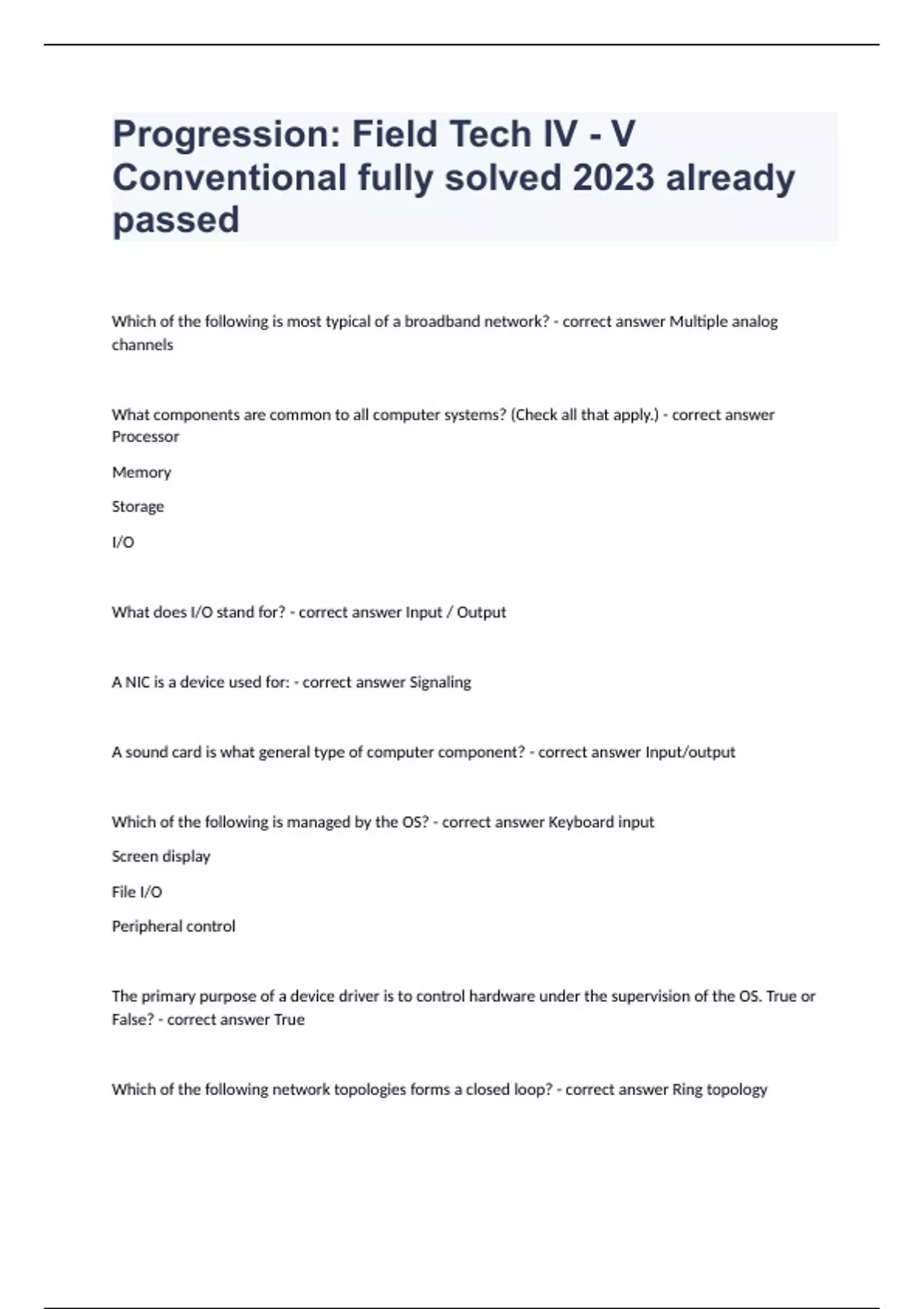 Progression: Field Tech IV - V Conventional fully solved 2023 already passedWhich of the following is most typical of a broadband network? - correct answer Multiple analog channels What components are common to all computer systems? (Check all that apply.) - correct answer Processor Memory Storage I/O What does I/O stand for? - correct answer Input / Output A NIC is a device used for: - correct answer Signaling A sound card is what general type of computer component? - correct answer Input/output Which of the following is managed by the OS? - correct answer Keyboard input Screen display File I/O Peripheral control The primary purpose of a device driver is to control hardware under the supervision of the OS. True or False? - correct answer True Which of the following network topologies forms a closed loop? - correct answer Ring topology
