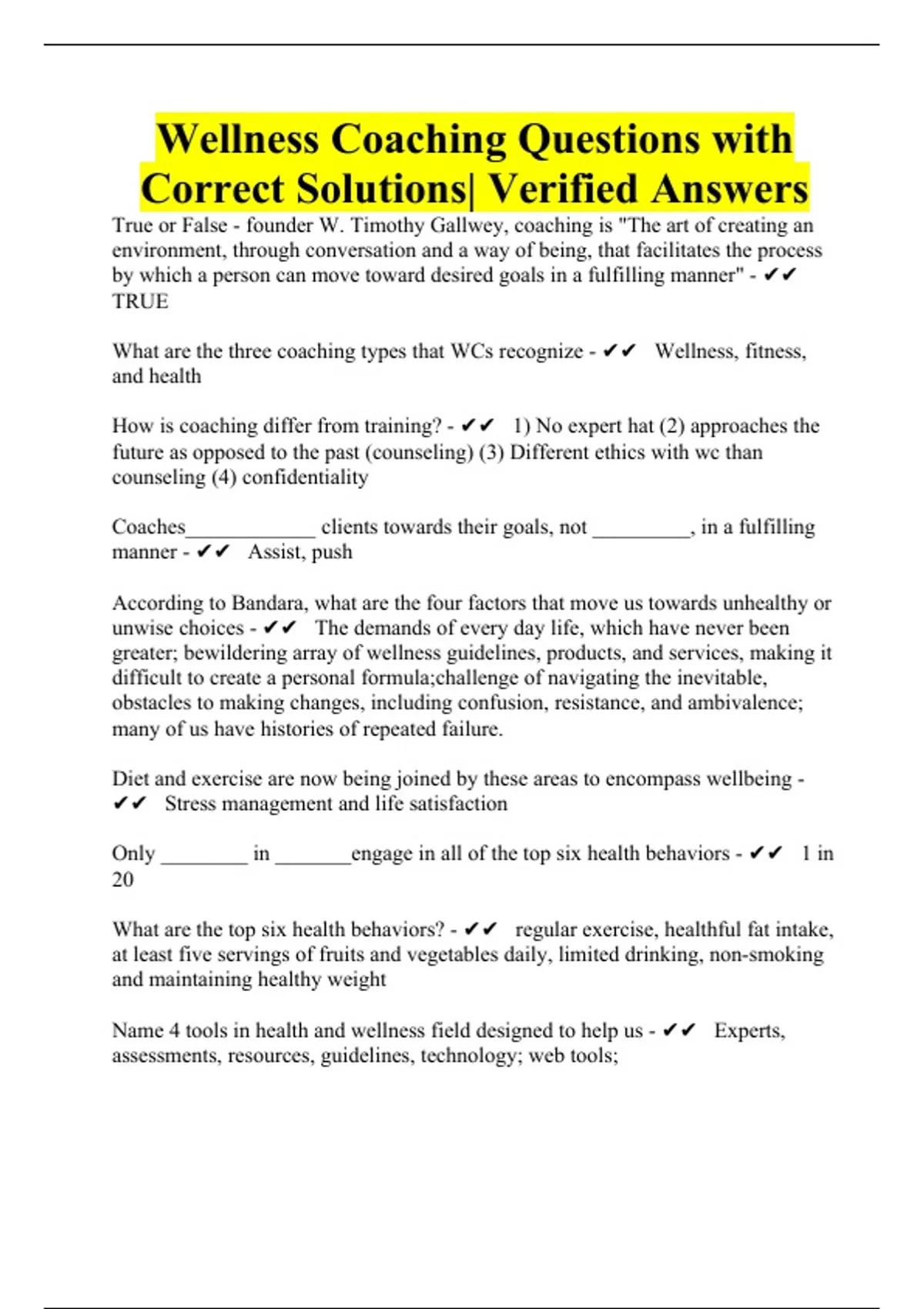 wellness coaching questions with correct solutions