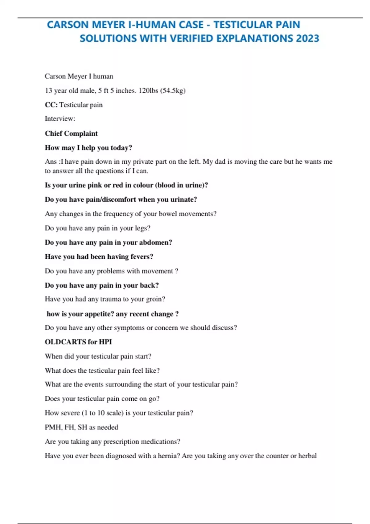 CARSON MEYER I-HUMAN CASE - TESTICULAR PAIN SOLUTIONS WITH VERIFIED EXPLANATIONS 2023 Carson Meyer I human 13 year old male, 5 ft 5 inches. 120lbs (54.5kg) CC: Testicular pain Interview: Chief Complaint How may I help you today? Ans :I have pain down in my private part on the left. My dad is moving the care but he wants me to answer all the questions if I can. Is your urine pink or red in colour (blood in urine)? Do you have pain/discomfort when you urinate? Any changes in the frequency of your bowel movements? Do you have any pain in your legs? Do you have any pain in your abdomen? Have you had been having fevers? Do you have any problems with movement ? Do you have any pain in your back? Have you had any trauma to your groin? how is your appetite? any recent change ? Do you have any other symptoms or concern we should discuss? OLDCARTS for HPI When did your testicular pain start? What does the testicular pain feel like? What are the events surrounding the start of your testicular pain? Does your testicular pain come on go? How severe (1 to 10 scale) is your testicular pain? PMH, FH, SH as needed Are you taking any prescription medications? Have you ever been diagnosed with a hernia? Are you taking any over the counter or herbal medications ? Do you have any allergies? How is your family and family life? Are there any diseases that run in your family? ROS focus on GI and GU