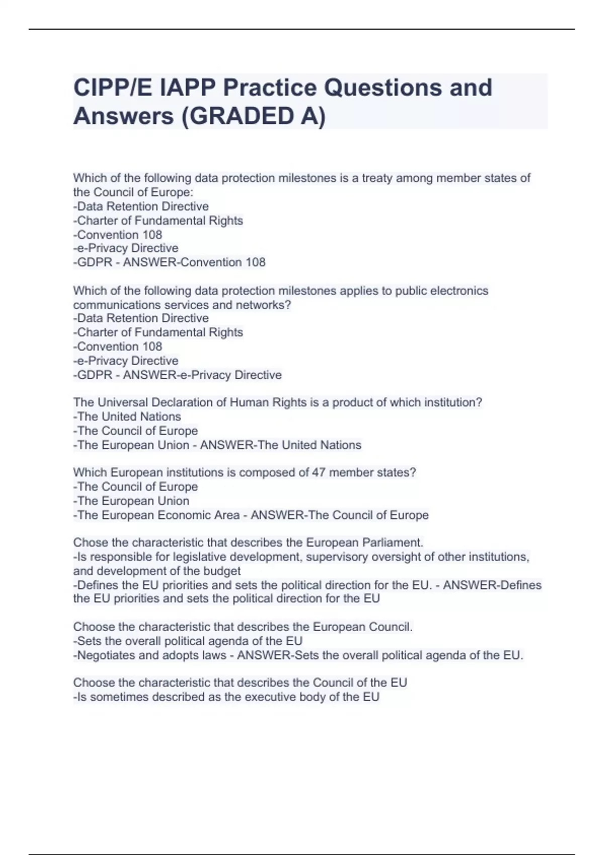 CIPP/E IAPP Exam Study Guide Questions and Answers (GRADED A+) CIPP/E IAPP Exam Study Guide Questions and Answers (GRADED A+) Which of the following data protection milestones is a treaty among member states of the Council of Europe: -Data Retention Directive -Charter of Fundamental Rights -Convention 108 -e-Privacy Directive -GDPR - ANSWER-Convention 108 Which of the following data protection milestones applies to public electronics communications services and networks? -Data Retention Directive -Charter of Fundamental Rights -Convention 108 -e-Privacy Directive -GDPR - ANSWER-e-Privacy Directive The Universal Declaration of Human Rights is a product of which institution? -The United Nations -The Council of Europe -The European Union - ANSWER-The United Nations Which European institutions is composed of 47 member states? -The Council of Europe -The European Union -The European Economic Area - ANSWER-The Council of Europe Chose the characteristic that describes the European Parliament. -Is responsible for legislative development, supervisory oversight of other institutions, and development of the budget -Defines the EU priorities and sets the political direction for the EU. - ANSWER-Defines the EU priorities and sets the political direction for the EU Choose the characteristic that describes the European Council. -Sets the overall political agenda of the EU -Negotiates and adopts laws - ANSWER-Sets the overall political agenda of the EU. Choose the characteristic that describes the Council of the EU -Is sometimes described as the executive body of the EU -Is one of the main decision-making bodies of the EU - ANSWER-Is one of the main decision making bodies of the EU.