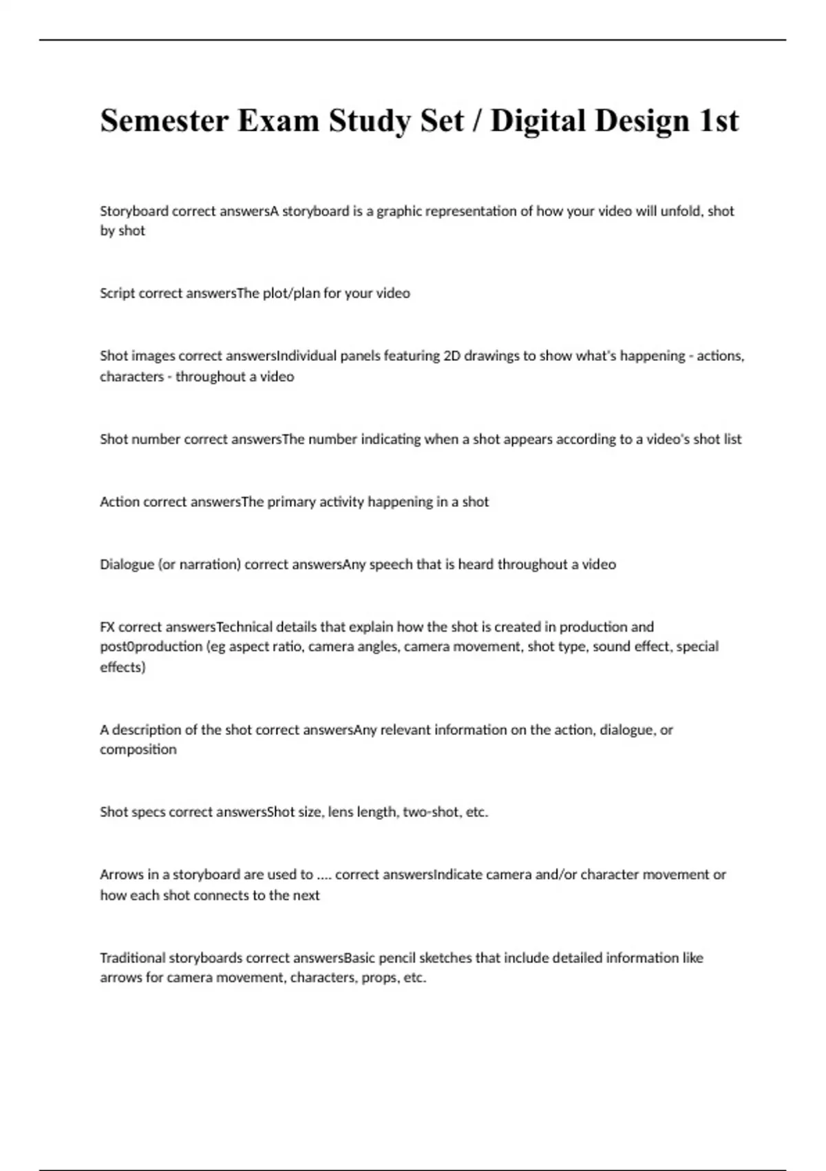 Storyboard correct answersA storyboard is a graphic representation of how your video will unfold, shot by shot Script correct answersThe plot/plan for your video Shot images correct answersIndividual panels featuring 2D drawings to show what's happening - actions, characters - throughout a video Shot number correct answersThe number indicating when a shot appears according to a video's shot list Action correct answersThe primary activity happening in a shot