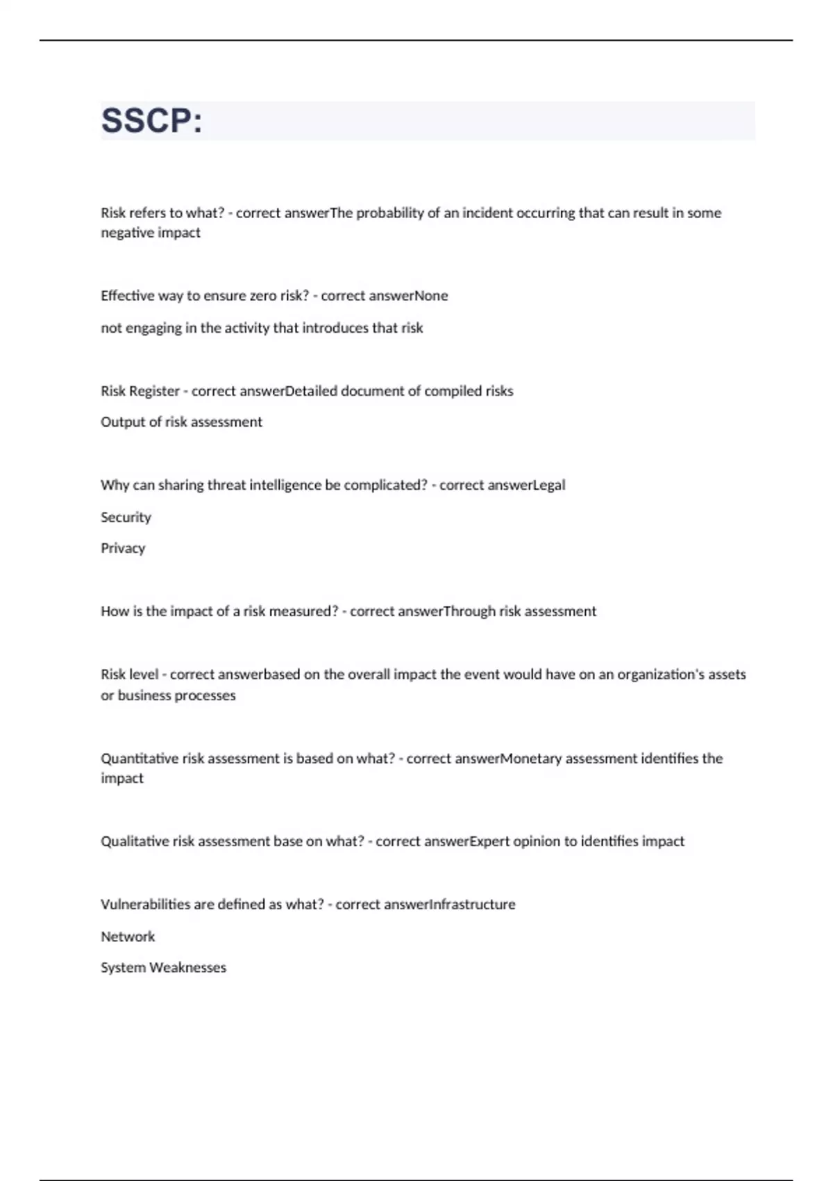 Risk refers to what? The probability of an incident occurring that can result in some negative impact Effective way to ensure zero risk? None not engaging in the activity that introduces that risk Risk Register Detailed document of compiled risks Output of risk assessment Why can sharing threat intelligence be complicated? Legal Security Privacy How is the impact of a risk measured? Through risk assessment Risk level based on the overall impact the event would have on an organization's assets or business processes Quantitative risk assessment is based on what? Monetary assessment identifies the impact Qualitative risk assessment base on what? Expert opinion to identifies impact Vulnerabilities are defined as what? Infrastructure Network System Weaknesses The vulnerabilities could be related to? System Security Design Implementation Internal Controls Loss occurs when? When a weakness is exploited by a threat What are come common vulnerabilities? Insufficient antivirus protection Disgruntled employees Inadequate access controls Lack of change management measures Insufficient system hardening Single points of system failure Uneducated users Risk assessments do what? examine risk within a set time period identify potential risks and mitigating measures