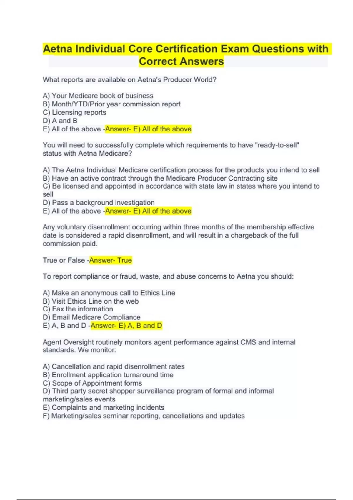Aetna Individual Core Certification Exam Questions with Correct Answers. What reports are available on Aetna's Producer World? A) Your Medicare book of business B) Month/YTD/Prior year commission report C) Licensing reports D) A and B E) All of the above -Answer- E) All of the above You will need to successfully complete which requirements to have "ready-to-sell" status with Aetna Medicare? A) The Aetna Individual Medicare certification process for the products you intend to sell B) Have an active contract through the Medicare Producer Contracting site C) Be licensed and appointed in accordance with state law in states where you intend to sell D) Pass a background investigation E) All of the above -Answer- E) All of the above Any voluntary disenrollment occurring within three months of the membership effective date is considered a rapid disenrollment, and will result in a chargeback of the full commission paid. True or False -Answer- True To report compliance or fraud, waste, and abuse concerns to Aetna you should: A) Make an anonymous call to Ethics Line B) Visit Ethics Line on the web C) Fax the information D) Email Medicare Compliance E) A, B and D -Answer- E) A, B and D.