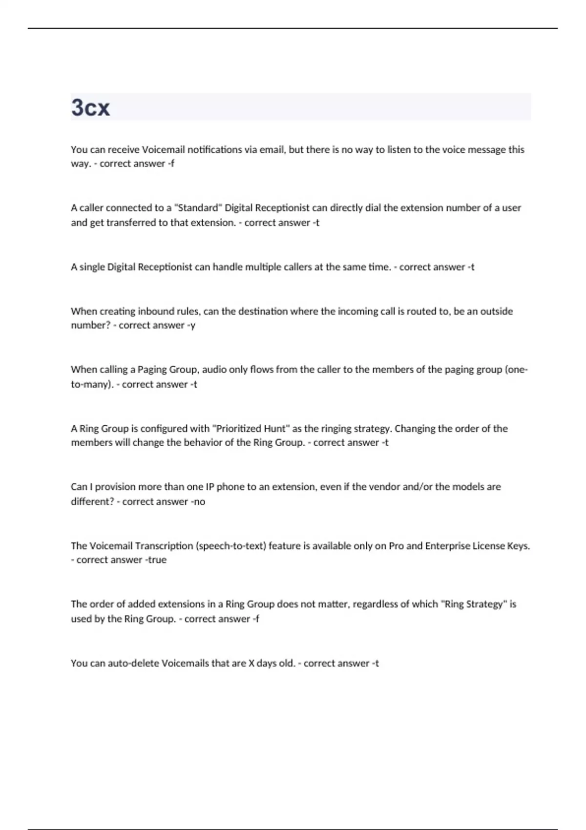 You can receive Voicemail notifications via email, but there is no way to listen to the voice message this way. f A caller connected to a "Standard" Digital Receptionist can directly dial the extension number of a user and get transferred to that extension. t A single Digital Receptionist can handle multiple callers at the same time. t When creating inbound rules, can the destination where the incoming call is routed to, be an outside number? y When calling a Paging Group, audio only flows from the caller to the members of the paging group (one-to-many). t A Ring Group is configured with "Prioritized Hunt" as the ringing strategy. Changing the order of the members will change the behavior of the Ring Group. t Can I provision more than one IP phone to an extension, even if the vendor and/or the models are different? no The Voicemail Transcription (speech-to-text) feature is available only on Pro and Enterprise License Keys. true The order of added extensions in a Ring Group does not matter, regardless of which "Ring Strategy" is used by the Ring Group. f You can auto-delete Voicemails that are X days old. t