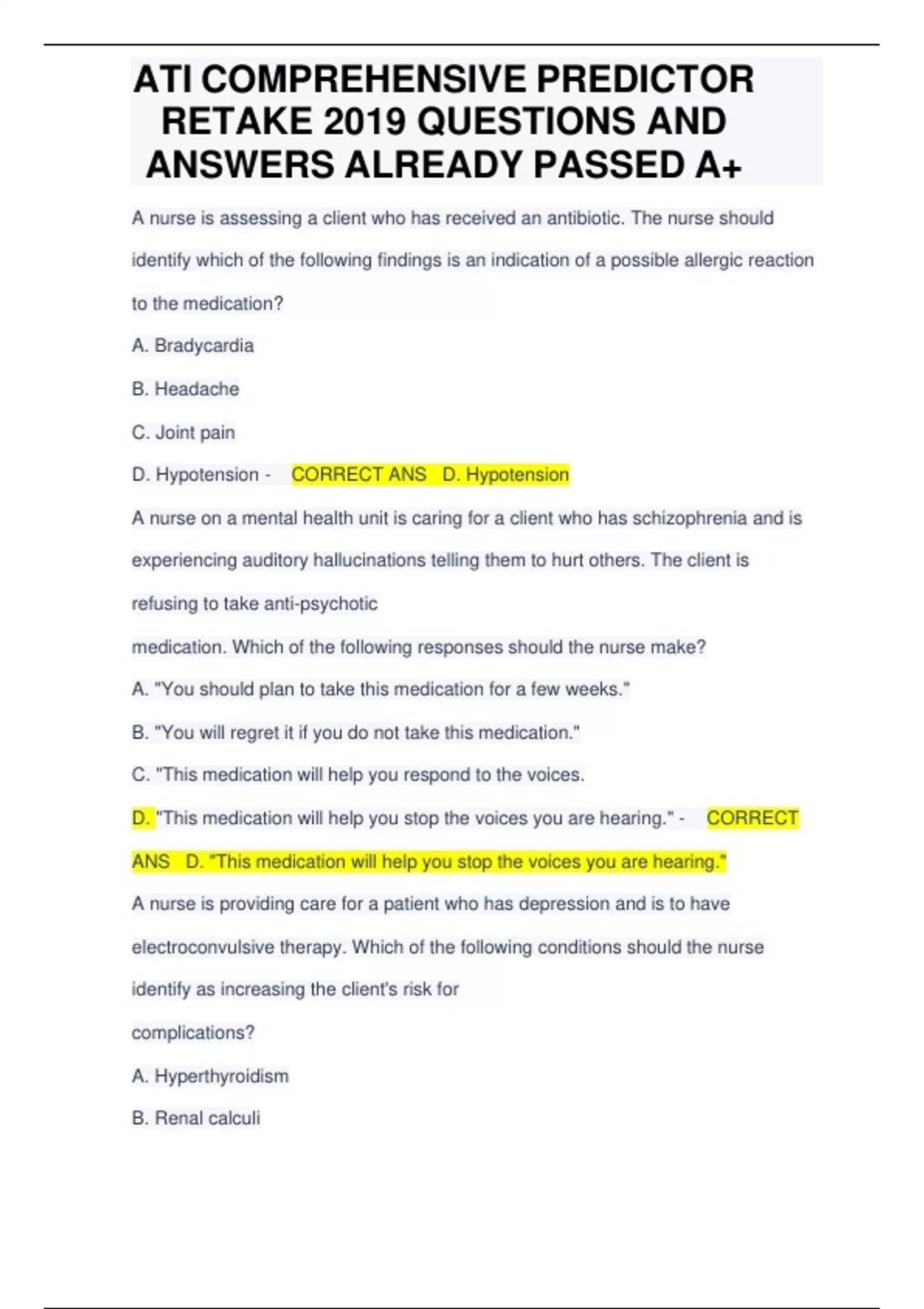 ATI COMPREHENSIVE PREDICTOR RETAKE 2019 QUESTIONS AND ANSWERS ALREADY PASSED A+