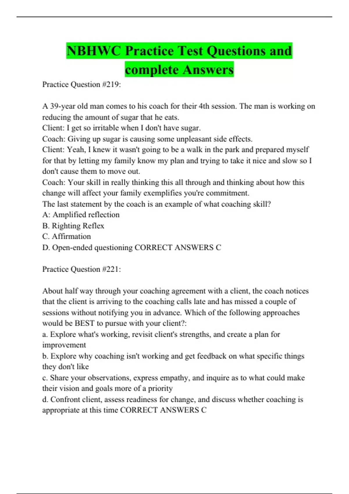 NBHWC Practice Test Questions and complete Answers Practice Question #219: A 39-year old man comes to his coach for their 4th session. The man is working on reducing the amount of sugar that he eats. Client: I get so irritable when I don't have sugar. Coach: Giving up sugar is causing some unpleasant side effects. Client: Yeah, I knew it wasn't going to be a walk in the park and prepared myself for that by letting my family know my plan and trying to take it nice and slow so I don't cause them to move out. Coach: Your skill in really thinking this all through and thinking about how this change will affect your family exemplifies you're commitment. The last statement by the coach is an example of what coaching skill? Practice Question #221: About half way through your coaching agreement with a client, the coach notices that the client is arriving to the coaching calls late and has missed a couple of sessions without notifying you in advance. Which of the following approaches would be BEST to pursue with your client?: Practice Question #223: A client comes to their 5th coaching session and has made progress in improving their sleep but is having trouble with their goal of increasing their physical activity. Client: "I really want to feel better...but it's just too hard. I've got two jobs and I take care of my parents too." Which of the following coach responses is NOT a response that would increase change talk?