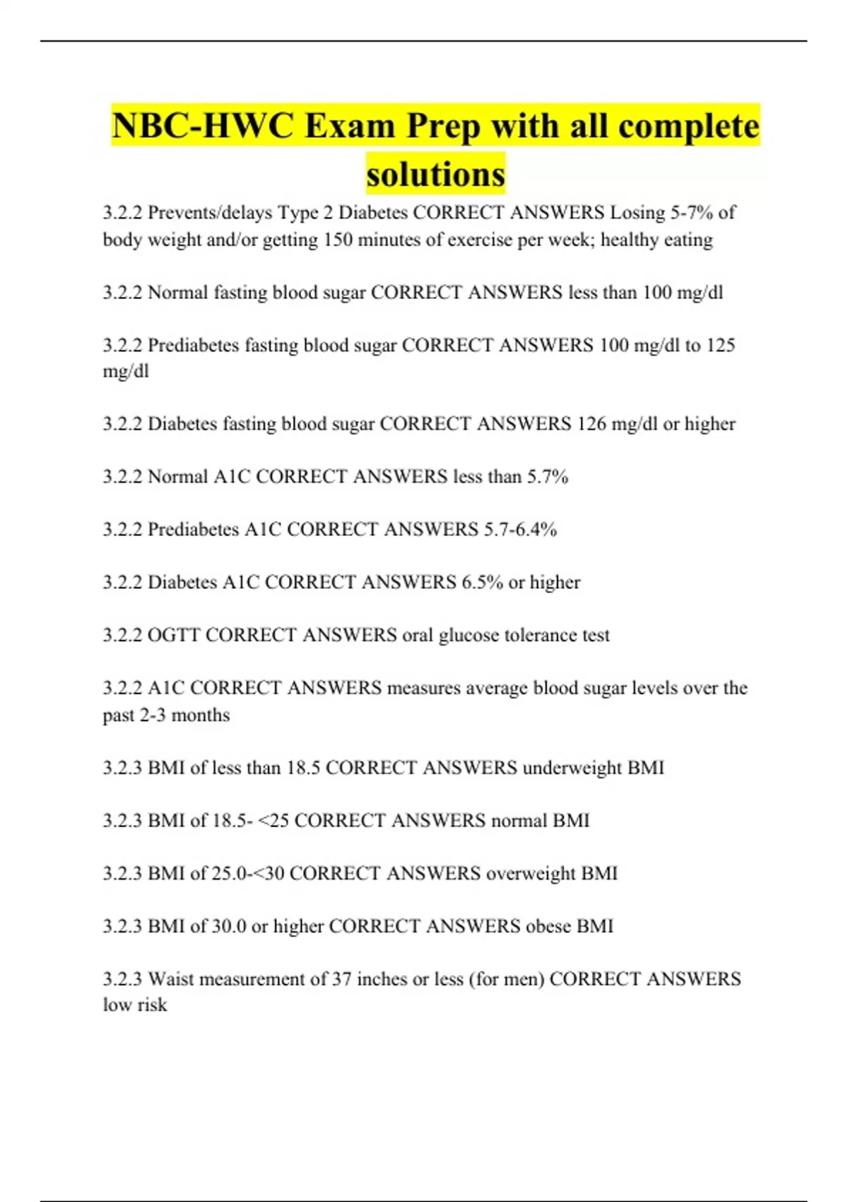 NBC-HWC Exam Prep with all complete solutions 3.2.2 Prevents/delays Type 2 Diabetes 3.2.2 Normal fasting blood sugar 3.2.2 Prediabetes fasting blood sugar 3.2.2 Diabetes fasting blood sugar 3.2.2 Normal A1C 3.2.2 Prediabetes A1C 3.2.2 Diabetes A1C 3.2.2 OGTT 3.2.2 A1C 3.2.3 BMI of less than 18.5 3.2.3 BMI of 18.5- <25 3.2.3 BMI of 25.0-<30 3.2.3 BMI of 30.0 or higher