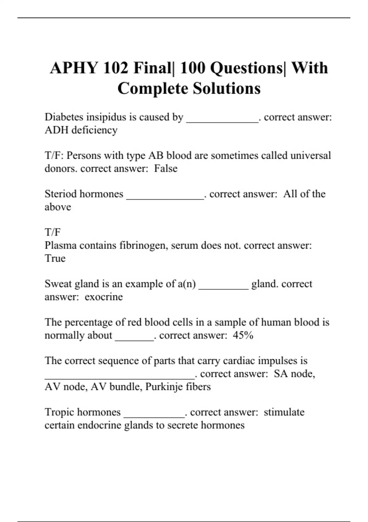 Diabetes insipidus is caused by _____________. correct answer: ADH deficiency T/F: Persons with type AB blood are sometimes called universal donors. correct answer: False Steriod hormones ______________. correct answer: All of the above T/F Plasma contains fibrinogen, serum does not. correct answer: True Sweat gland is an example of a(n) _________ gland. correct answer: exocrine The percentage of red blood cells in a sample of human blood is normally about _______. correct answer: 45% The correct sequence of parts that carry cardiac impulses is ___________________________. correct answer: SA node, AV node, AV bundle, Purkinje fibers Tropic hormones ___________. correct answer: stimulate certain endocrine glands to secrete hormones Bile salts function like detergents in that they ___________ fat globules. correct answer: emulsify In an autoimmune disease, the immune response