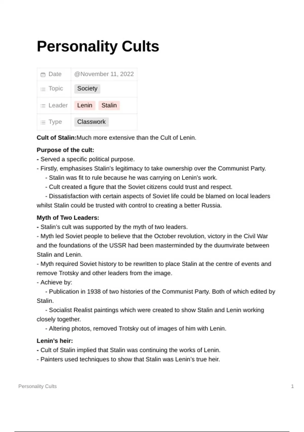 - Cult of Stalin implied that Stalin was continuing the works of Lenin.
