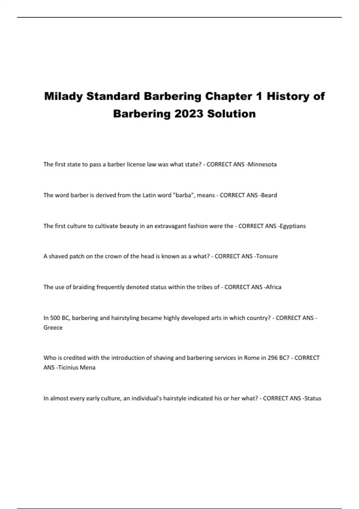 Milady Standard Barbering Chapter 1 History of Barbering 2023 Solution The first state to pass a barber license law was what state? - CORRECT ANS -Minnesota The word barber is derived from the Latin word "barba", means - CORRECT ANS -Beard The first culture to cultivate beauty in an extravagant fashion were the - CORRECT ANS -Egyptians A shaved patch on the crown of the head is known as a what? - CORRECT ANS -Tonsure The use of braiding frequently denoted status within the tribes of - CORRECT ANS -Africa