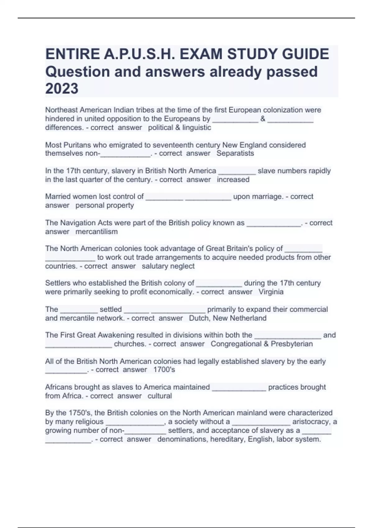 ENTIRE A.P.U.S.H. EXAM STUDY GUIDE Question and answers already passed 2023 Northeast American Indian tribes at the time of the first European colonization were hindered in united opposition to the Europeans by ___________ & ___________ differences. - correct answer political & linguistic Most Puritans who emigrated to seventeenth century New England considered themselves non-____________. - correct answer Separatists In the 17th century, slavery in British North America _________ slave numbers rapidly in the last quarter of the century. - correct answer increased Married women lost control of _________ ___________ upon marriage. - correct answer personal property The Navigation Acts were part of the British policy known as _____________. - correct answer mercantilism