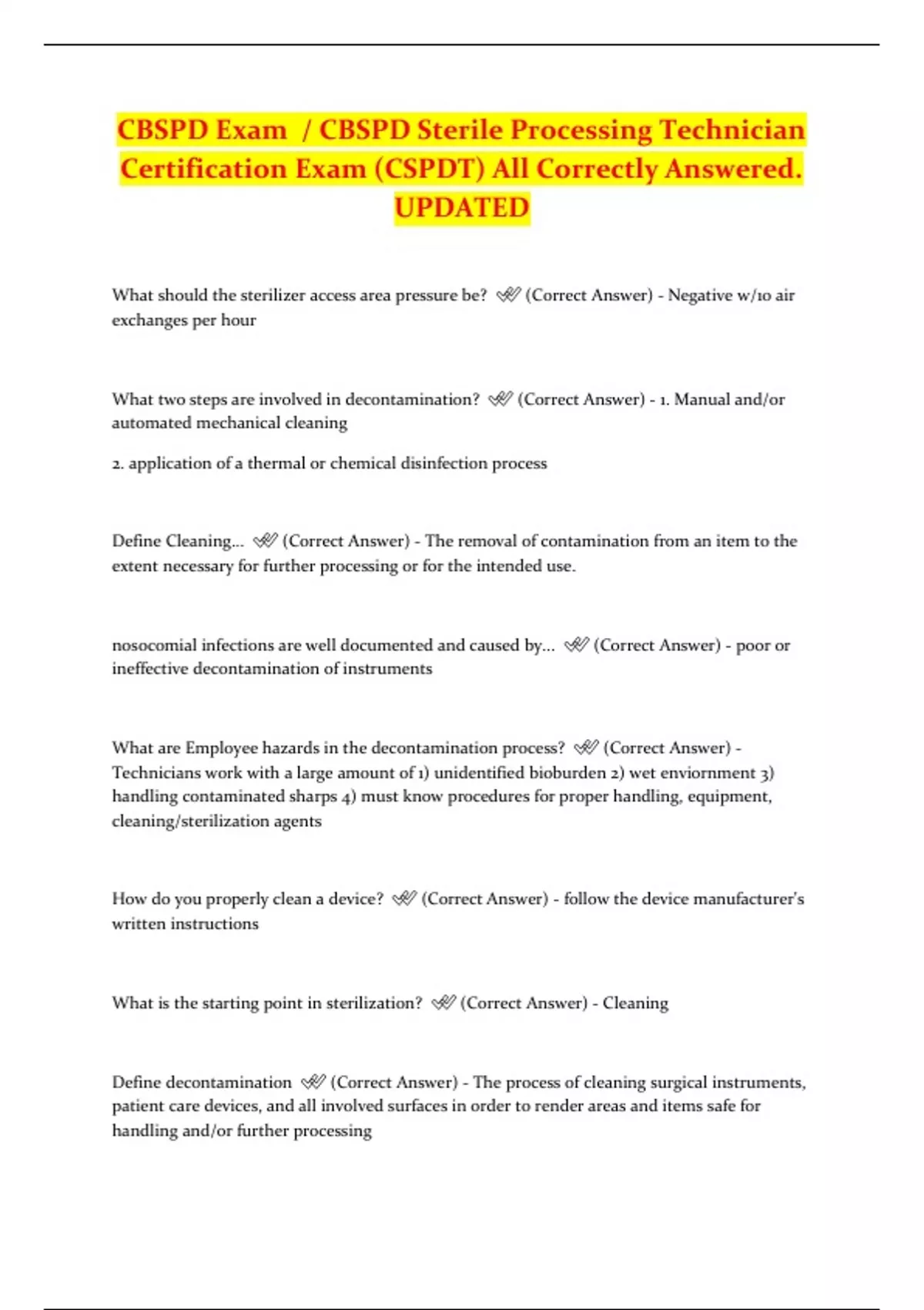 CBSPD Exam / CBSPD Sterile Processing Technician Certification Exam (CSPDT) All Correctly Answered. UPDATED What should the sterilizer access area pressure be? (Correct Answer) - Negative w/10 air exchanges per hour What two steps are involved in decontamination? (Correct Answer) - 1. Manual and/or automated mechanical cleaning 2. application of a thermal or chemical disinfection process Define Cleaning... (Correct Answer) - The removal of contamination from an item to the extent necessary for further processing or for the intended use. nosocomial infections are well documented and caused by... (Correct Answer) - poor or ineffective decontamination of instruments What are Employee hazards in the decontamination process? (Correct Answer) - Technicians work with a large amount of 1) unidentified bioburden 2) wet enviornment 3) handling contaminated sharps 4) must know procedures for proper handling, equipment, cleaning/sterilization agents How do you properly clean a device? (Correct Answer) - follow the device manufacturer's written instructions What is the starting point in sterilization? (Correct Answer) - Cleaning Define decontamination (Correct Answer) - The process of cleaning surgical instruments, patient care devices, and all involved surfaces in order to render areas and items safe for handling and/or further processing