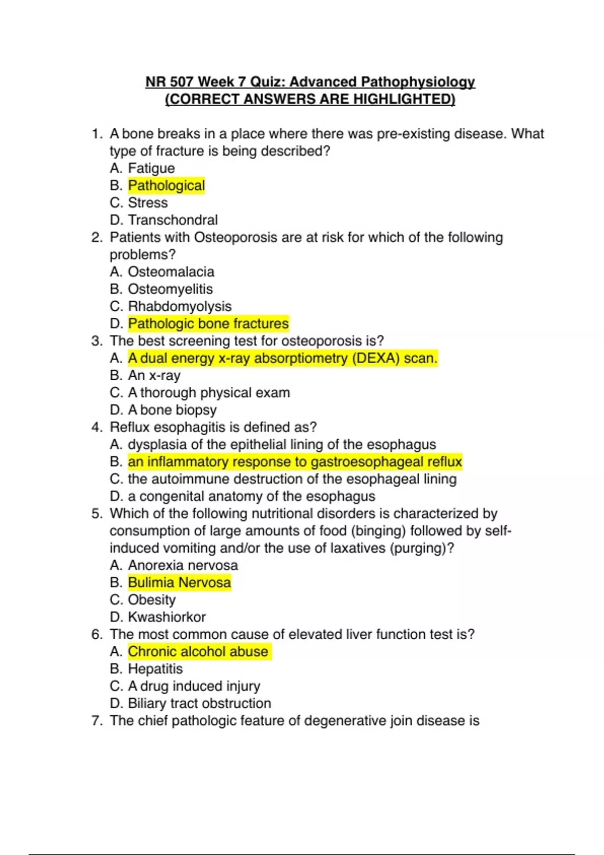 NR 507 Week 7 Quiz: Advanced Pathophysiology (CORRECT ANSWERS ARE HIGHLIGHTED) A bone breaks in a place where there was pre-existing disease. What type of fracture is being described? Patients with Osteoporosis are at risk for which of the following problems?