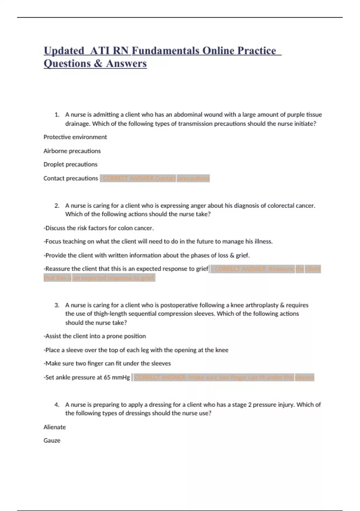 Updated ATI RN Fundamentals Online Practice Questions & Answers 1. A nurse is admitting a client who has an abdominal wound with a large amount of purple tissue drainage. Which of the following types of transmission precautions should the nurse initiate? Protective environment Airborne precautions Droplet precautions Contact precautions - CORRECT ANSWER Contact precautions 2. A nurse is caring for a client who is expressing anger about his diagnosis of colorectal cancer. Which of the following actions should the nurse take? -Discuss the risk factors for colon cancer. -Focus teaching on what the client will need to do in the future to manage his illness. -Provide the client with written information about the phases of loss & grief. -Reassure the client that this is an expected response to grief. - CORRECT ANSWER -Reassure the client that this is an expected response to grief. 3. A nurse is caring for a client who is postoperative following a knee arthroplasty & requires the use of thigh-length sequential compression sleeves. Which of the following actions should the nurse take? -Assist the client into a prone position -Place a sleeve over the top of each leg with the opening at the knee -Make sure two finger can fit under the sleeves -Set ankle pressure at 65 mmHg - CORRECT ANSWER -Make sure two finger can fit under the sleeves