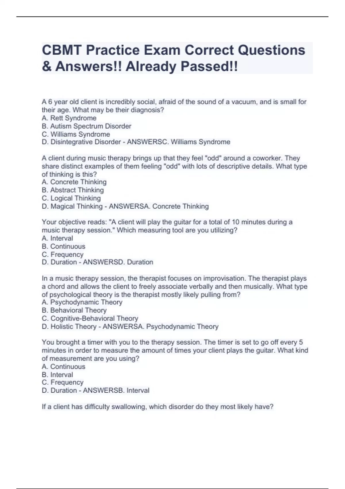 A 6 year old client is incredibly social, afraid of the sound of a vacuum, and is small for their age. What may be their diagnosis? A. Rett Syndrome B. Autism Spectrum Disorder C. Williams Syndrome D. Disintegrative Disorder - ANSWERSC. Williams Syndrome A client during music therapy brings up that they feel "odd" around a coworker. They share distinct examples of them feeling "odd" with lots of descriptive details. What type of thinking is this? A. Concrete Thinking B. Abstract Thinking C. Logical Thinking D. Magical Thinking - ANSWERSA. Concrete Thinking Your objective reads: "A client will play the guitar for a total of 10 minutes during a music therapy session." Which measuring tool are you utilizing? A. Interval B. Continuous C. Frequency D. Duration - ANSWERSD. Duration In a music therapy session, the therapist focuses on improvisation. The therapist plays a chord and allows the client to freely associate verbally and then musically. What type of psychological theory is the therapist mostly likely pulling from? A. Psychodynamic Theory B. Behavioral Theory C. Cognitive-Behavioral Theory D. Holistic Theory - ANSWERSA. Psychodynamic Theory You brought a timer with you to the therapy session. The timer is set to go off every 5 minutes in order to measure the amount of times your client plays the guitar. What kind of measurement are you using? A. Continuous B. Interval C. Frequency D. Duration - ANSWERSB. Interval If a client has difficulty swallowing, which disorder do they most likely have? A. Aphasia B. Dysphagia C. Dysarthria D. Ataxia - ANSWERSB. Dyphagia A teenage client is referred to music therapy for anger management. During the assessment, the client shares that he is angry about having to come to therapy, and states that he enjoys heavy metal music. The therapist does not feel as though they are able to adequately play heavy metal music, and dislikes the genre. The BEST action for the therapist is to