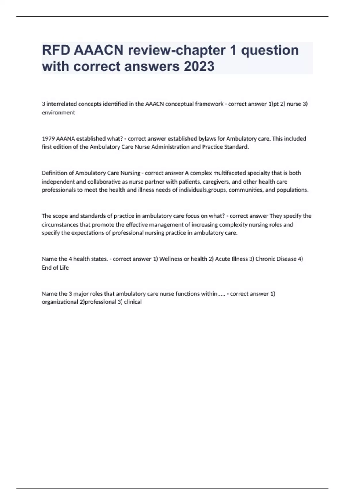 RFD AAACN review-chapter 1 question with correct answers 20233 interrelated concepts identified in the AAACN conceptual framework - correct answer 1)pt 2) nurse 3) environment 1979 AAANA established what? - correct answer established bylaws for Ambulatory care. This included first edition of the Ambulatory Care Nurse Administration and Practice Standard. Definition of Ambulatory Care Nursing - correct answer A complex multifaceted specialty that is both independent and collaborative as nurse partner with patients, caregivers, and other health care professionals to meet the health and illness needs of individuals,groups, communities, and populations. The scope and standards of practice in ambulatory care focus on what? - correct answer They specify the circumstances that promote the effective management of increasing complexity nursing roles and specify the expectations of professional nursing practice in ambulatory care. Name the 4 health states. - correct answer 1) Wellness or health 2) Acute Illness 3) Chronic Disease 4) End of Life Name the 3 major roles that ambulatory care nurse functions within..... - correct answer 1) organizational 2)professional 3) clinical