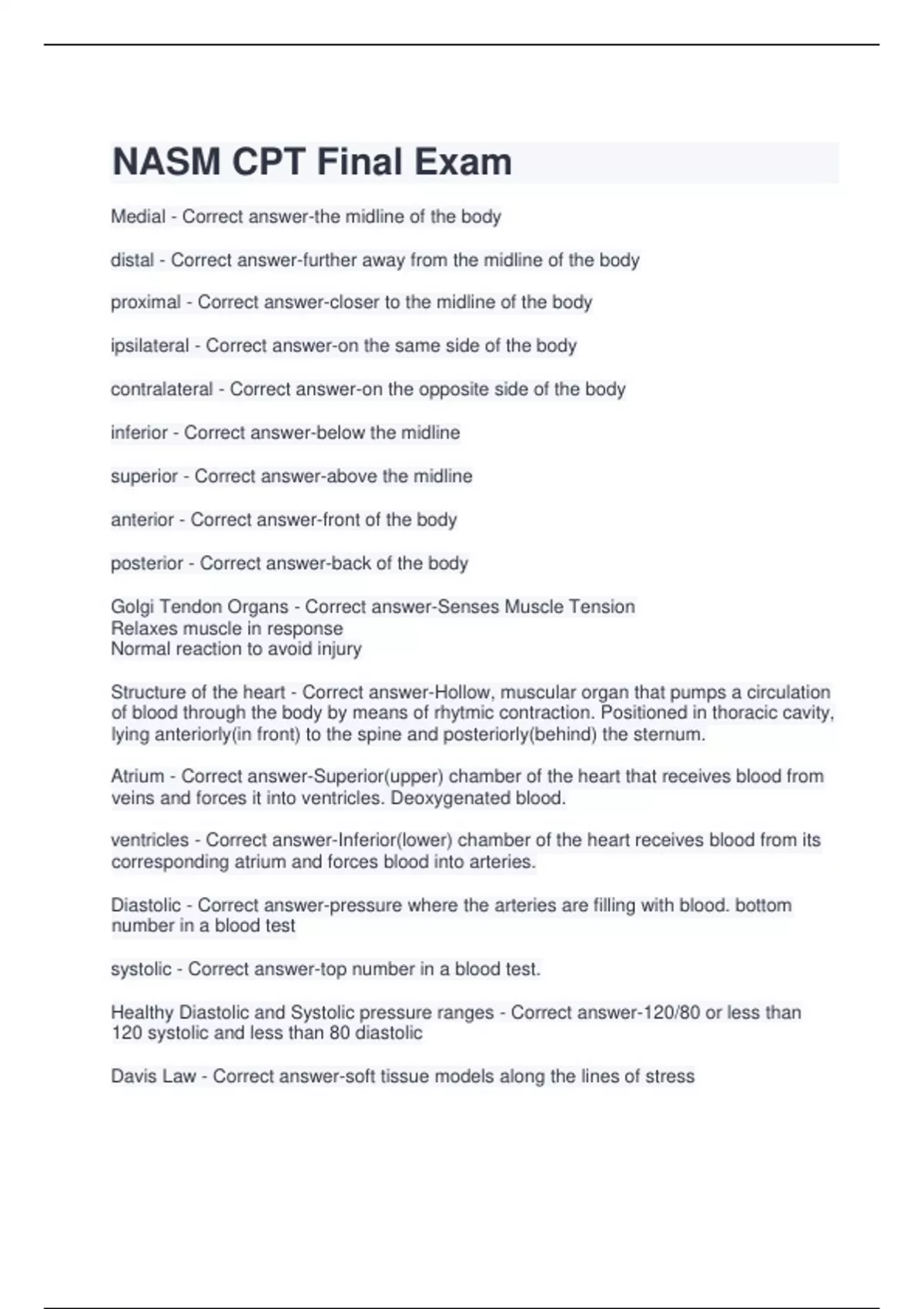Medial - Correct answer-the midline of the body distal - Correct answer-further away from the midline of the body proximal - Correct answer-closer to the midline of the body ipsilateral - Correct answer-on the same side of the body contralateral - Correct answer-on the opposite side of the body inferior - Correct answer-below the midline superior - Correct answer-above the midline anterior - Correct answer-front of the body posterior - Correct answer-back of the body Golgi Tendon Organs - Correct answer-Senses Muscle Tension Relaxes muscle in response Normal reaction to avoid injury Structure of the heart - Correct answer-Hollow, muscular organ that pumps a circulation of blood through the body by means of rhytmic contraction. Positioned in thoracic cavity, lying anteriorly(in front) to the spine and posteriorly(behind) the sternum. Atrium - Correct answer-Superior(upper) chamber of the heart that receives blood from veins and forces it into ventricles. Deoxygenated blood. ventricles - Correct answer-Inferior(lower) chamber of the heart receives blood from its corresponding atrium and forces blood into arteries. Diastolic - Correct answer-pressure where the arteries are filling with blood. bottom number in a blood test systolic - Correct answer-top number in a blood test. Healthy Diastolic and Systolic pressure ranges - Correct answer-120/80 or less than 120 systolic and less than 80 diastolic Davis Law - Correct answer-soft tissue models along the lines of stress Sliding Filament theory - Correct answer-a sarcomere shortens as a result of the Z lines moving closer together 2. the Z lines converge as the result of myosin heads attaching to the actin filament and asynchronously pulling (power strokes) the actin filament across the myosin, resulting in shortening of the muscle fiber. saggital plane of motion - Correct answer-split the body to left and right sides frontal - Correct answer-split the body front and back halfs transverse - Correct answer-split the body the top and bottom halves exercises in the saggital plane of motion - Correct answer-bicep curls, Leg Extensions and Leg Curls. Leg extensions and leg curls target your quadriceps and hamstrings, respectively. ... Front Dumbbell Raises. ... Crunches. ... Barbell Biceps Curls. exercises in the frontal plane of motion - Correct answer-side lunge, lateral dumbbell raise, ice skater exercises in the transverse plane of motion - Correct answer-rotation, wood-chop throw, medicine ball rotation chest pass Hydrogen concepts for water and sports drinks - Correct answer-consume 3L of water a day. That's 13 cups. Consume sports drink if longer than 60 minutes of exercise. 8% carbs. 16-24 fl oz for every pound of body weight lost after exercise. best ways to achieve weight loss through nutritional concepts - Correct answer-Small decreases in food and beverage calories and increase physical activity. Distribute protein, carbs, and fat throughout day. Consume less than 10% of cals from saturated fat. Choose whole grains and fiber rich fruits and veggies over refined grains and simple sugars. Limit alcohol. Schedule no fewer than four and as many as six meals a day. Avoid empty calories and highly processed foods. Drink plenty of water(minimum 9 to 13 cups a day)