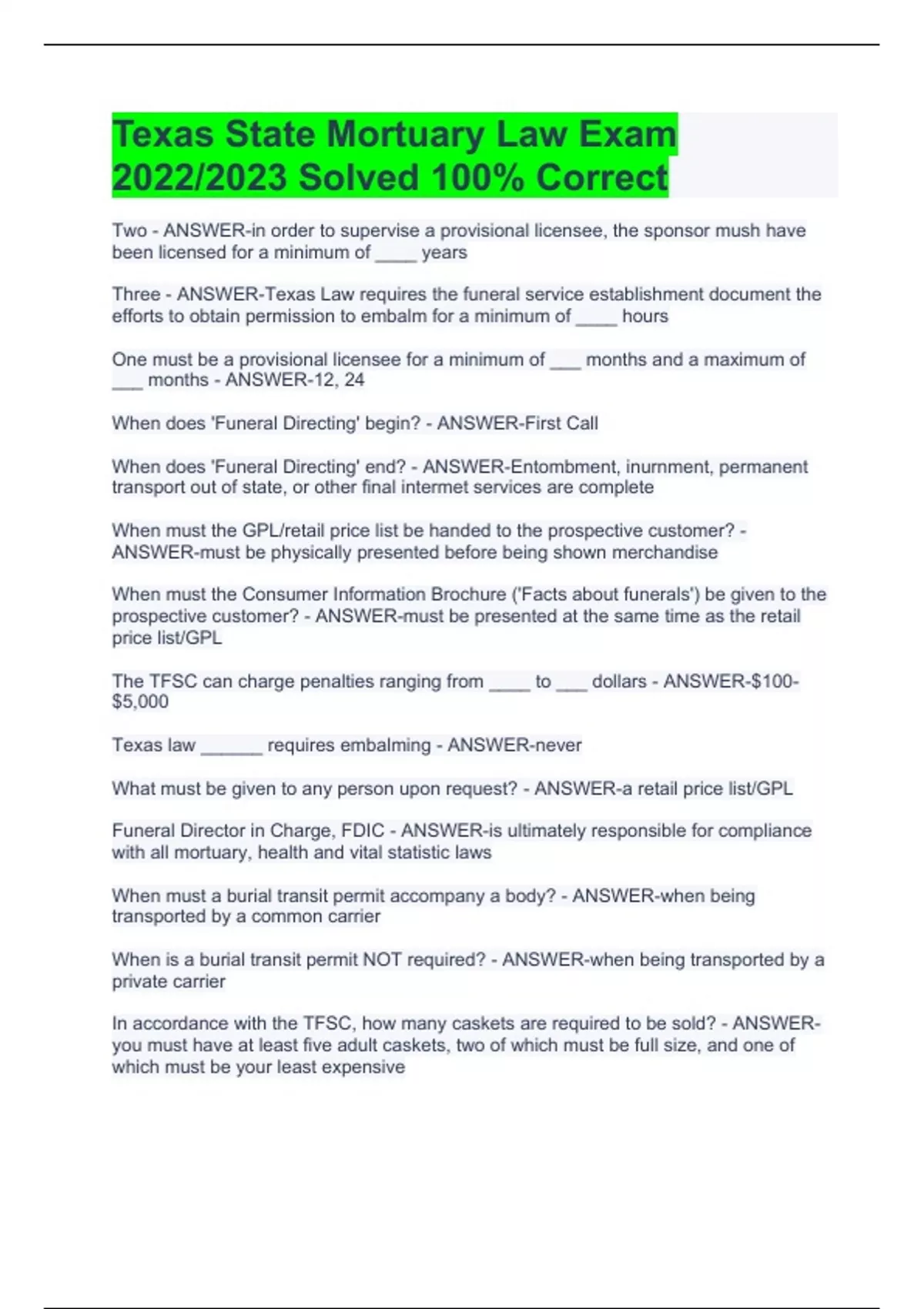 Texas State Mortuary Law Exam 2022/2023 Solved 100% Correct