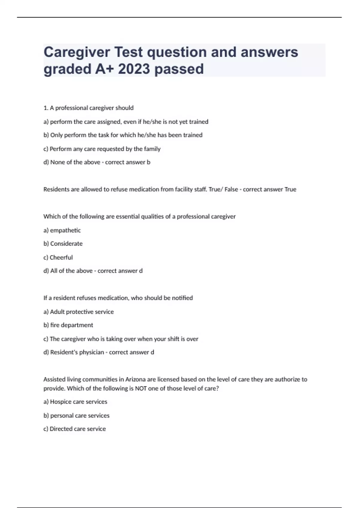 Caregiver Test question and answers graded A+ 2023 passed1. A professional caregiver should a) perform the care assigned, even if he/she is not yet trained b) Only perform the task for which he/she has been trained c) Perform any care requested by the family d) None of the above - correct answer b Residents are allowed to refuse medication from facility staff. True/ False - correct answer True Which of the following are essential qualities of a professional caregiver a) empathetic b) Considerate c) Cheerful d) All of the above - correct answer d If a resident refuses medication, who should be notified a) Adult protective service b) fire department c) The caregiver who is taking over when your shift is over d) Resident's physician - correct answer d Assisted living communities in Arizona are licensed based on the level of care they are authorize to provide. Which of the following is NOT one of those level of care? a) Hospice care services b) personal care services c) Directed care service d) supervisory care services - correct answer a