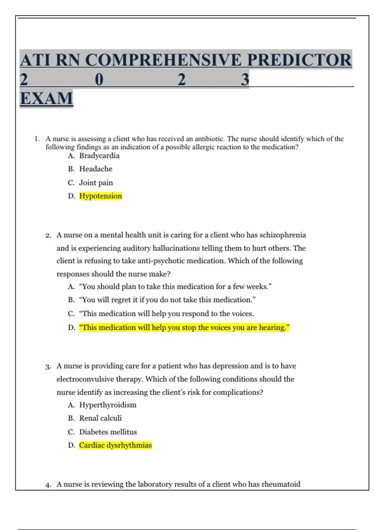 ATI RN COMPREHENSIVE PREDICTOR 2 0 2 3 EXAM 1. A nurse is assessing a client who has received an antibiotic. The nurse should identify which of the following findings as an indication of a possible allergic reaction to the medication? A. Bradycardia B. Headache C. Joint pain D. Hypotension 2. A nurse on a mental health unit is caring for a client who has schizophrenia and is experiencing auditory hallucinations telling them to hurt others. The client is refusing to take anti-psychotic medication. Which of the following responses should the nurse make? A. “You should plan to take this medication for a few weeks.” B. “You will regret it if you do not take this medication.” C. “This medication will help you respond to the voices. D. “This medication will help you stop the voices you are hearing.” 3. A nurse is providing care for a patient who has depression and is to have electroconvulsive therapy. Which of the following conditions should the nurse identify as increasing the client’s risk for complications? A. Hyperthyroidism B. Renal calculi C. Diabetes mellitus D. Cardiac dysrhythmias
