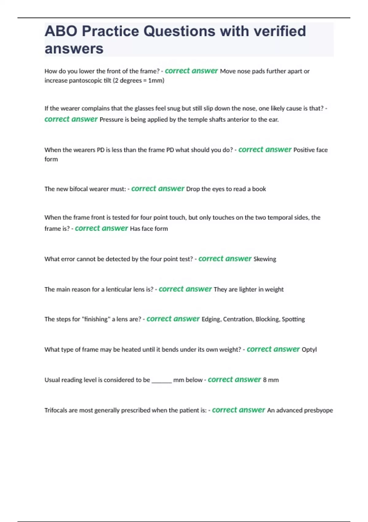 ABO Practice Questions with verified answers