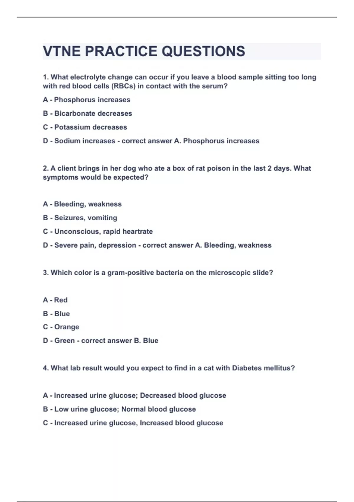 1. What electrolyte change can occur if you leave a blood sample sitting too long with red blood cells (RBCs) in contact with the serum? A - Phosphorus increases B - Bicarbonate decreases C - Potassium decreases D - Sodium increases A. Phosphorus increases 2. A client brings in her dog who ate a box of rat poison in the last 2 days. What symptoms would be expected? A - Bleeding, weakness B - Seizures, vomiting C - Unconscious, rapid heartrate D - Severe pain, depression A. Bleeding, weakness 3. Which color is a gram-positive bacteria on the microscopic slide? A - Red B - Blue C - Orange D - Green B. Blue 4. What lab result would you expect to find in a cat with Diabetes mellitus? A - Increased urine glucose; Decreased blood glucose B - Low urine glucose; Normal blood glucose C - Increased urine glucose, Increased blood glucose D - Urinary infection; Low blood glucose C. Increased urine glucose, increased blood glucose 5. Which forceps secure drapes to the patient by penetrating the skin? A - Backhaus B - Roeder C - Brown-Adson D - Crile A. Backhaus 6. A rare Albanian hairy iguana has been prescribed "Iggy-cote" medicated shampoo q.o.d. for dandruff. How often does the iguana get treated? A - Once a day B - Four times a day C - Every other day D - As needed C. Every other day 7. Which two white blood cells are phagocytic (eat foreign cells and material by engulfing them). A - B-Lymphocyte, Eosinophil B - Monocyte, Neutrophil C - Basophil, Lymphocyte D - Neutrophil, Thrombocyte B. Monocyte, neutrophil What is a band neutrophil? A - An old neutrophil B - Immature neutrophil C - A depleted neutrophil D - A toxic neutrophil E - A neutrophil that plays the drums B. Immature neutrophil 9. How do you prevent laryngospasm in cats before inducing anesthesia? A - Pre-medicate with acepromazine B - 1-2% Lidocaine spray C - Pre-medicate with atropine or glycopyrrolate D - Avoid halothane B - 1-2% Lidocaine spray 10. Which term describes inflammation of the testicle? A - Orchitis B - Phimosis C - Phlebitis D - Cryptorchid A - Orchitis 11. Which choice is often used in combination with ketamine or thiopental to induce anesthesia in horses? A - Halothane B - Phenobarbital C - Naloxone D - Guaifenesin D. Guaifenesin 12. What does it mean if a cat is azotemic? A - Blood urea nitrogen (BUN) is increased B - Blood urea nitrogen (BUN) is decreased C - Creatinine is high D - Sodium-Potassium ratio is too low A. Blood urea nitrogen (BUN) is increased 14. Which drug can reverse the effects of xylazine (alpha2-adrenergic agonist with analgesic and sedative effects)? A - Yohimbine B - Pralidoxime C - Atropine D - Diazepam (Valium®) A. Yohimbine 15. Which one of the following dog breeds is classified as brachycephalic? A - Golden retriever B - Greyhound C - English bull dog D - Great Dane C. English Bull dog 16. Which kind of tissue causes the most x-ray scatter? A - Thick body parts B - Thin body parts C - Joints 8 cm thick or less D - Delicate bone, like nasal area A. Thick body parts 17. You are called to a farm to help do a routine dental exam and float the teeth of an 8-year old Standardbred mare. What parts get filed down with the rasp when a horse gets its teeth floated? A - Lingual aspect-upper molar arcade, Buccal aspect-lower molar arcade B - Buccal aspect-upper molar arcade, rostral points of wolf teeth C - Lingual aspect-upper molar arcade, Lingual aspect-lower molar arcade D - Buccal aspect-upper molar arcade, Buccal aspect-lower molar arcade E - Buccal aspect-upper molar arcade, Lingual aspect-lower molar arcade E - Buccal aspect-upper molar arcade, Lingual aspect-lower molar arcade 19. A 3 year-old domestic longhair female spayed cat is presented at your clinic with hypersalivation, vomiting, diarrhea, tremors, stumbling and a temperature of 105.2 F (40.7 C). Her pupils are normal size and responsive to light. While the vet examines the animal, she has a seizure. The owner relates that he had treated her the night before with a flea dip he had originally bought for his dog. What toxic ingredient do you suspect most highly? A - D-Limonene B - Carbamate C - Permethrin D - Organophosphate C - Permethrin 20. Which choice lists these species in order of gestation length, from longest to shortest pregnancy? A - Cow, Horse, Pig, Dog, Goat B - Cow, Horse, Pig, Goat, Dog C - Llama, Pig, Sheep, Ferret, Cat D - Horse, Cow, Goat, Pig, Dog D - Horse, Cow, Goat, Pig, Dog 21. What is a nosocomial infection? A - A sinusitis, typically found in horses B - An upper respiratory infection C - An infection acquired in a hospital D - An infection acquired secondary to injury C - An infection acquired in a hospital 22. Why is the brachioradialis muscle clinically significant in dogs and cats? A - Adjacent to the tibial nerve B - Associated with brachial plexus avulsion C - Lies above axillary artery D - Implicated in medial patellar luxation E - Can be mistaken for cephalic vein in venipuncture E - Can be mistaken for cephalic vein in venipuncture What is the clinical significance of the femoral triangle in dogs and cats? A - Associated with brachial plexus avulsion B - Good place to take pulse from femoral artery C - Often damaged with anterior cruciate injuries D - Pulse oximeters attach there E - Surgical approach for hip dysplasia repair B - Good place to take pulse from femoral artery How long after birth does gut closure typically occur in calves and foals? (when protective maternal antibodies can no longer be absorbed from the gut to the bloodstream) A - 1-3 hours B - 3-6 hours C - 9-12 hours D - 15-18 hours E - 18-24 hours E - 18-24 hours