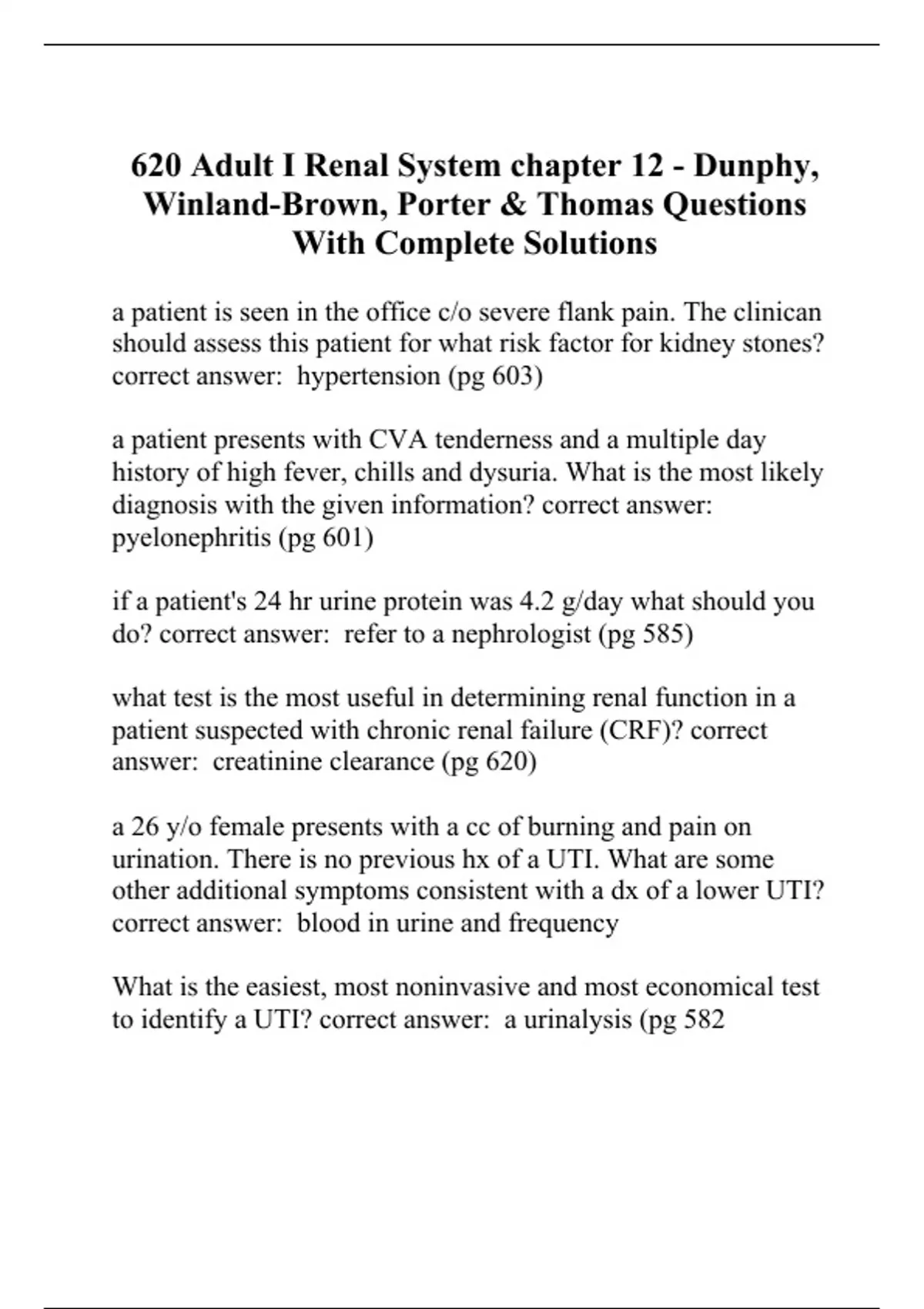 620 Adult I Renal System chapter 12 - Dunphy, Winland-Brown, Porter & Thomas Questions With Complete Solutions