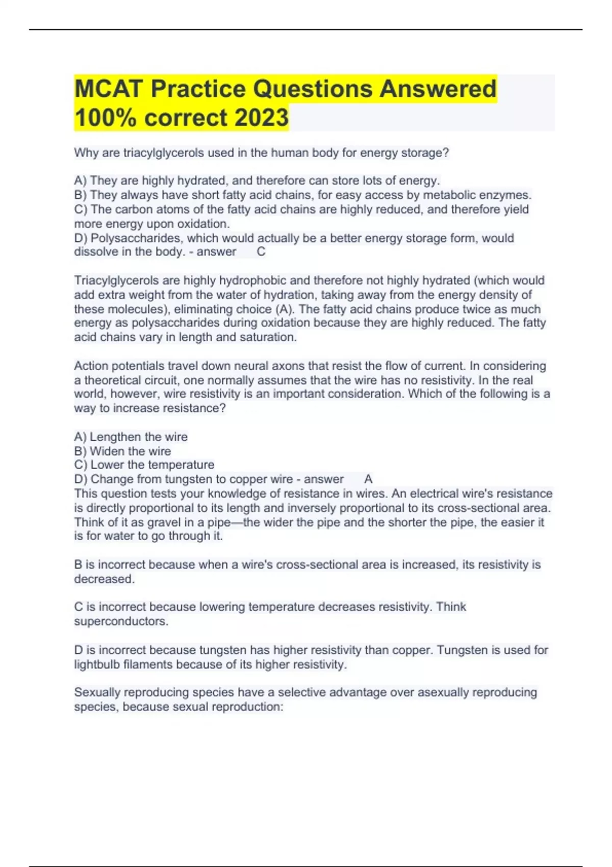 MCAT Practice Questions Answered 100% correct 2023 Why are triacylglycerols used in the human body for energy storage? A) They are highly hydrated, and therefore can store lots of energy. B) They always have short fatty acid chains, for easy access by metabolic enzymes. C) The carbon atoms of the fatty acid chains are highly reduced, and therefore yield more energy upon oxidation. D) Polysaccharides, which would actually be a better energy storage form, would dissolve in the body. C Triacylglycerols are highly hydrophobic and therefore not highly hydrated (which would add extra weight from the water of hydration, taking away from the energy density of these molecules), eliminating choice (A). The fatty acid chains produce twice as much energy as polysaccharides during oxidation because they are highly reduced. The fatty acid chains vary in length and saturation. Action potentials travel down neural axons that resist the flow of current. In considering a theoretical circuit, one normally assumes that the wire has no resistivity. In the real world, however, wire resistivity is an important consideration. Which of the following is a way to increase resistance? A) Lengthen the wire B) Widen the wire C) Lower the temperature D) Change from tungsten to copper wire A This question tests your knowledge of resistance in wires. An electrical wire's resistance is directly proportional to its length and inversely proportional to its cross-sectional area. Think of it as gravel in a pipe—the wider the pipe and the shorter the pipe, the easier it is for water to go through it. B is incorrect because when a wire's cross-sectional area is increased, its resistivity is decreased. C is incorrect because lowering temperature decreases resistivity. Think superconductors. D is incorrect because tungsten has higher resistivity than copper. Tungsten is used for lightbulb filaments because of its higher resistivity. Sexually reproducing species have a selective advantage over asexually reproducing species, because sexual reproduction: A) is more energy efficient. B) creates novel genetic recombinations. C) decreases the likelihood of mutations. D) always decreases offspring survival rate. B The reason those species that reproduce sexually have a selective advantage is because gene recombination is a given with every fertilization—two genetically unique nuclei—the sperm nucleus and the egg nucleus--fuse to form an equally genetically unique zygote. This is the main means of introducing phenotypic variability into a population. Pus is primarily composed of phagocytosed bacterial remnants. Which of the following would you expect to find in a microscopic sample of pus? A) Red blood cells, white blood cells, and platelets B) Granulocytes, monocytes, and macrophages C) Eosinophils, basophils, and neutrophils D) Collagen, white blood cells, and calcium B Phagocytosis plays an important role in both the nonspecific and humoral response to foreign pathogens. At the level of the skin, macrophages dwell in the connective tissue surrounding the organs of the body. Neutrophils are recruited to the site of entry and become part of the non-specific response to invading bacteria, working in combination with monocytes and macrophages to completely decompose bacteria. The cell-mediated branch of the immune system does not result in pus formation. Which of the following is true about cholesterol? A) Cholesterol always increases membrane fluidity in cells. B) Cholesterol is a steroid precursor. C) Cholesterol is a precursor for vitamin A, which is produced in the skin. D) Cholesterol interacts only with the hydrophobic tails of phospholipids. B Cholesterol is a steroid precursor that has variable effects on membrane fluidity depending on temperature, eliminating choice (A). It interacts with both the hydrophobic tails and the hydrophilic heads of membrane lipids, nullifying choice (D). It is also a precursor for vitamin D (not vitamin A), which can be produced in the skin in a UV-driven reaction, eliminating choice (C). Osteogenesis imperfecta is an autosomal dominant disease that results in abnormal collagen synthesis and fragile bone structure. What is true regarding the probability that the sister of an affected man will have the disease, if their mother was unaffected? A) The probability equals 50%. B) The probability depends on the genotype of the father, which cannot be determined from the given information. C) The probability depends on the genotype of the mother, which cannot be determined from the given information. D) The probability depends on the genotype of the brother, which cannot be determined from the given information. B If the disease is autosomal dominant, from the passage, we know the mother had two good alleles. Therefore, the father had at least 1 diseased allele: heterozygous or homozygous dominant (i.e. diseased). If the father were homozygous, the sister would have a 100% chance of getting the disease. If the father were heterozygous, the sister would have a 50% chance. Therefore, choice (B) is correct (A) No, it depends on the father's genotype. (C) We know that the mother is homozygous recessive since she is unaffected. (D) The brother's genotype is not important and can be determined: it is heterozygous. Which of the following statements regarding fetal circulation is FALSE? A) In the umbilical cord, there are more arteries than veins. B) The foramen ovale is the only shunt that connects two chambers of the heart. C) Blood flow in the ductus arteriosus is from the aorta to the pulmonary artery. D) The ductus venosus is the only shunt that bypasses the liver. C Blood flow in the ductus arteriosus is from the pulmonary artery to the aorta. The direction of flow is determined by the pressure differential between the right side of the heart (and pulmonary circulation) vs. the left side of the heart (and systemic circulation). Unlike in adults, the right side of the heart is at a higher pressure during