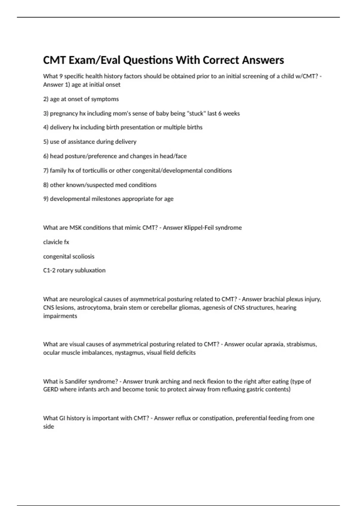 What 9 specific health history factors should be obtained prior to an initial screening of a child w/CMT? - Answer 1) age at initial onset 2) age at onset of symptoms 3) pregnancy hx including mom's sense of baby being "stuck" last 6 weeks 4) delivery hx including birth presentation or multiple births 5) use of assistance during delivery 6) head posture/preference and changes in head/face 7) family hx of torticullis or other congenital/developmental conditions 8) other known/suspected med conditions 9) developmental milestones appropriate for age What are MSK conditions that mimic CMT? - Answer Klippel-Feil syndrome clavicle fx congenital scoliosis C1-2 rotary subluxation What are neurological causes of asymmetrical posturing related to CMT? - Answer brachial plexus injury, CNS lesions, astrocytoma, brain stem or cerebellar gliomas, agenesis of CNS structures, hearing impairments What are visual causes of asymmetrical posturing related to CMT? - Answer ocular apraxia, strabismus, ocular muscle imbalances, nystagmus, visual field deficits What is Sandifer syndrome? - Answer trunk arching and neck flexion to the right after eating (type of GERD where infants arch and become tonic to protect airway from refluxing gastric contents) What GI history is important with CMT? - Answer reflux or constipation, preferential feeding from one side What is Grisel Syndrome? - Answer subluxation of A-A joint from inflammatory/ligamentous laxity following an infectious process in head/neck, usually retropharyngeal abscesses (deep neck space infection leading to inflammatory torticollis and vertebral subluxation) Why is it important to determine age at initial onset and age at onset of symptoms with CMT? - Answer determines prognosis What is Klippel-Feil syndrome? - Answer Congenital fusion of any 2 of the 7 cervical vertebrae. Triad of short neck, low posterior hair line, limited range of motion. What red flags that should be examined for CMT? - Answer - atypical positions, such as right cervical rotation with a right lateral flexion - asymmetrical cervical vertebrae on palpation - acute pain responses on cervical movement - tissue masses outside of the SCM or in other areas of the body - children with Down syndrome - C1-C2 cervical spine instability - late onset of a head tilt with known symmetry for the first few months of life - stridor, wheezing, SOB, cyanotic lips What needs to be done as part of the MSK systems review with CMT? - Answer symmetrical shape of face/skull/spine symmetrical alignment of shoulder and hip girdles c-spine vertebrae anomalies rib cage symmetry DDH (developmental hip displasia) symmetrical PROM of neck palpation for SCM masses or restricted movement What needs to be done as part of the neuro systems review with CMT? - Answer - abnormal or asymmetrical tone - retention of primitive reflexes - resistance to movement - cranial nerve integrity - brachial plexus injury - temperament (irritability, alertness) - achievement of age-appropriate developmental milestones inclusive of cognitive and social integration w/in family setting - visual screen comprising symmetrical eye tracking in all directions, noting visual field defects and nystagmus as potential ocular causes of asymmetrical postures What needs to be done as part of the integ systems review with CMT? - Answer - skinfold symmetry of the hips and cervical regions - color and condition of skin w/special attention to signs of pressure and trauma that might cause asymmetrical posturing What needs to be done as part of the cardiorespiratory systems review with CMT? - Answer - symmetrical coloration - rib cage expansion - clavicle movement to r/o conditions that might cause asymmetrical posturing - acute upper respiratory tract distress What are causes of acquired torticullis? - Answer ocular lesions benign paroxysmal torticollis dystonic syndromes infections Arnold-Chiari malformation syringomyelia posterior fossa tumors trauma *acquired occurs later than congenital* What is craniosynostosis? - Answer premature closure of cranial sutures What are secondary impairments of craniosynostosis? - Answer restricted brain growth increased intracranial pressure *requires surgery and PT interventions* What premature suture closure is associated with CMT? - Answer lamboid