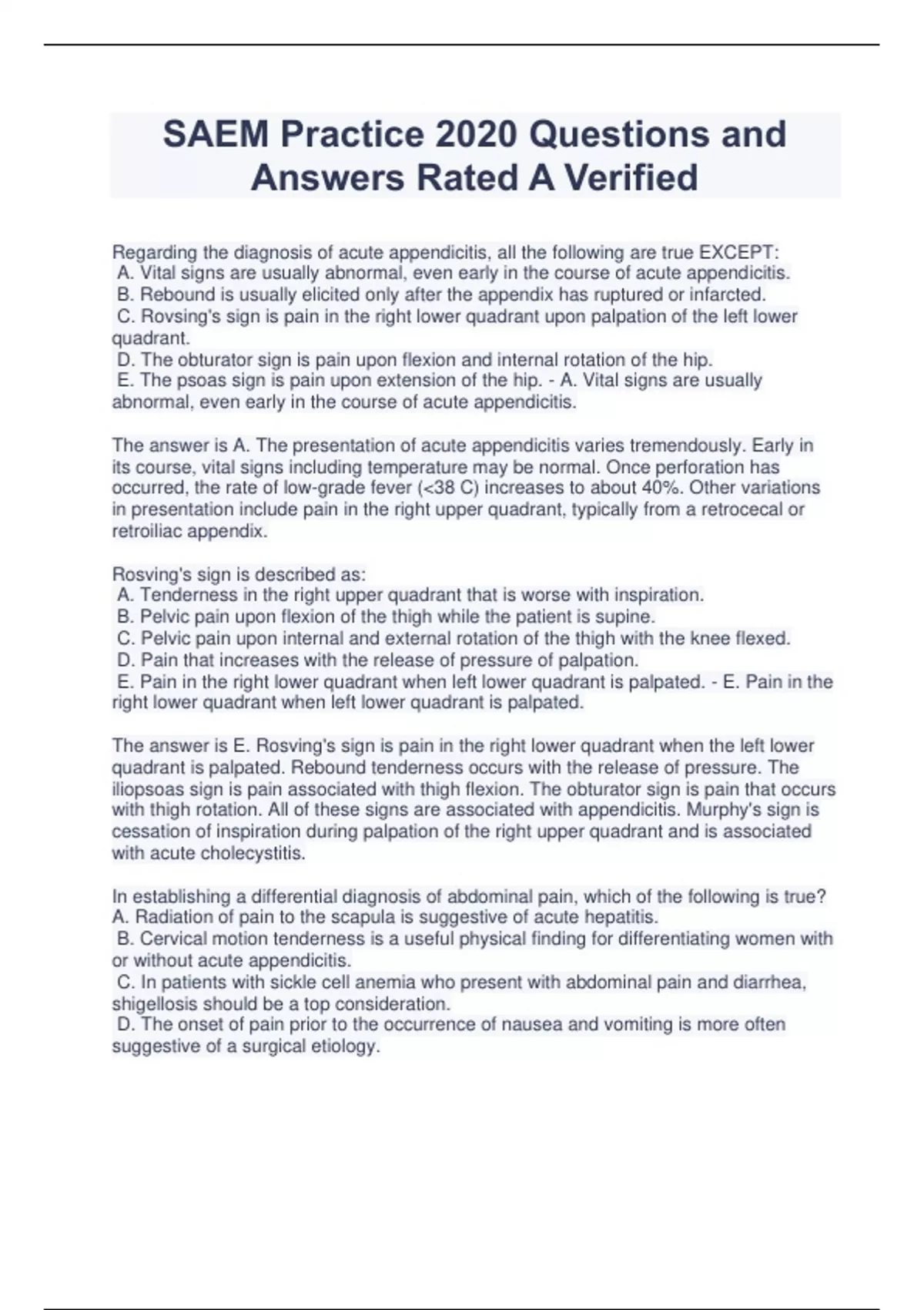 SAEM Practice 2020 Questions and Answers Rated A Verified