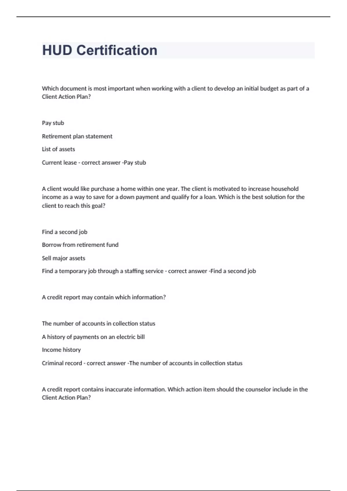 Which document is most important when working with a client to develop an initial budget as part of a Client Action Plan? Pay stub Retirement plan statement List of assets Current lease Pay stub A client would like purchase a home within one year. The client is motivated to increase household income as a way to save for a down payment and qualify for a loan. Which is the best solution for the client to reach this goal? Find a second job Borrow from retirement fund Sell major assets Find a temporary job through a staffing service Find a second job A credit report may contain which information? The number of accounts in collection status A history of payments on an electric bill Income history Criminal record The number of accounts in collection status A credit report contains inaccurate information. Which action item should the counselor include in the Client Action Plan? -Attach a letter to mortgage applications explaining the inaccuracies. -Investigate the reasons why the inaccuracies occurred to determine the responsible party. -Include a personal consumer statement on the credit report. -File a dispute with the appropriate credit reporting agency. File a dispute with the appropriate credit reporting agency.