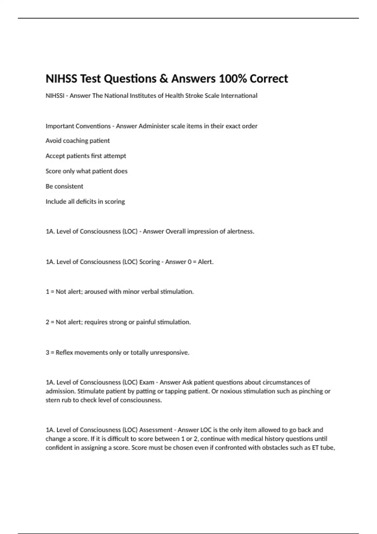 NIHSSI - Answer The National Institutes of Health Stroke Scale International Important Conventions - Answer Administer scale items in their exact order Avoid coaching patient Accept patients first attempt Score only what patient does Be consistent Include all deficits in scoring 1A. Level of Consciousness (LOC) - Answer Overall impression of alertness. 1A. Level of Consciousness (LOC) Scoring - Answer 0 = Alert. 1 = Not alert; aroused with minor verbal stimulation. 2 = Not alert; requires strong or painful stimulation. 3 = Reflex movements only or totally unresponsive. 1A. Level of Consciousness (LOC) Exam - Answer Ask patient questions about circumstances of admission. Stimulate patient by patting or tapping patient. Or noxious stimulation such as pinching or stern rub to check level of consciousness. 1A. Level of Consciousness (LOC) Assessment - Answer LOC is the only item allowed to go back and change a score. If it is difficult to score between 1 or 2, continue with medical history questions until confident in assigning a score. Score must be chosen even if confronted with obstacles such as ET tube, language barrier, or oral tracheae trauma or bandages. Score 0, keenly responsive. Score 2, repeated verbal stimulation to attend, strong painful noxious stimulation to make movements. Score of 3 is generally considered to be in a coma. Score of 3 requires noxious painful stimuli by sternal rub. Only reflexive posturing movements in response to painful noxious stimuli. Requires particular attention as it impacts rest of exam. Continue with exam and attempt all following items. 1B. Level of Consciousness Questions - Answer Question 1. Month of year Question 2. Patients age 1B. Level of Consciousness Questions Scoring - Answer 0 = Answers both questions correctly 1 = Answers one question correctly 2 = Answers neither question correctly