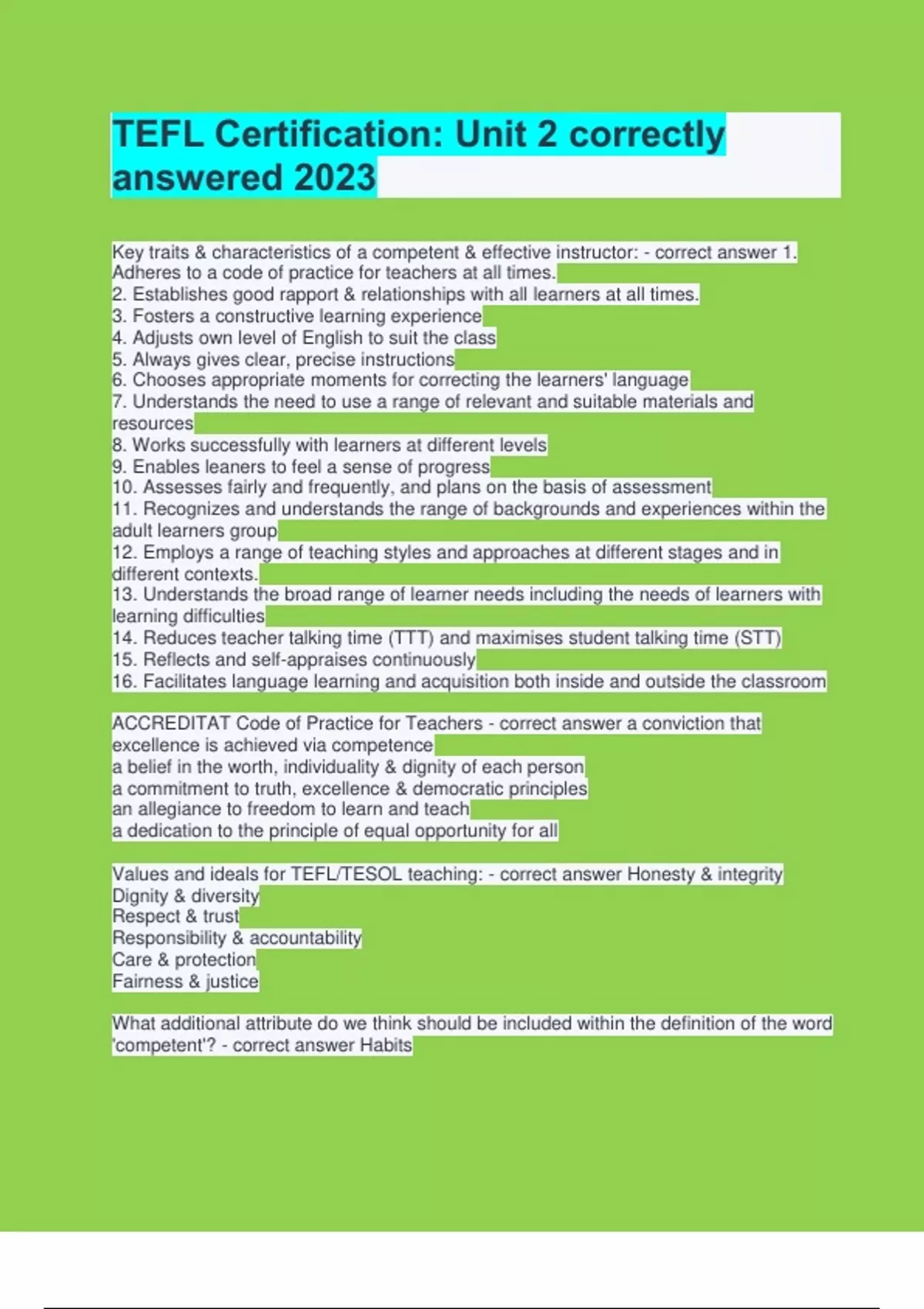 Key traits & characteristics of a competent & effective instructor: - correct answer 1. Adheres to a code of practice for teachers at all times. 2. Establishes good rapport & relationships with all learners at all times. 3. Fosters a constructive learning experience 4. Adjusts own level of English to suit the class 5. Always gives clear, precise instructions 6. Chooses appropriate moments for correcting the learners' language 7. Understands the need to use a range of relevant and suitable materials and resources 8. Works successfully with learners at different levels 9. Enables leaners to feel a sense of progress 10. Assesses fairly and frequently, and plans on the basis of assessment 11. Recognizes and understands the range of backgrounds and experiences within the adult learners group 12. Employs a range of teaching styles and approaches at different stages and in different contexts. 13. Understands the broad range of learner needs including the needs of learners with learning difficulties 14. Reduces teacher talking time (TTT) and maximises student talking time (STT) 15. Reflects and self-appraises continuously 16. Facilitates language learning and acquisition both inside and outside the classroom ACCREDITAT Code of Practice for Teachers - correct answer a conviction that excellence is achieved via competence a belief in the worth, individuality & dignity of each person a commitment to truth, excellence & democratic principles an allegiance to freedom to learn and teach a dedication to the principle of equal opportunity for all