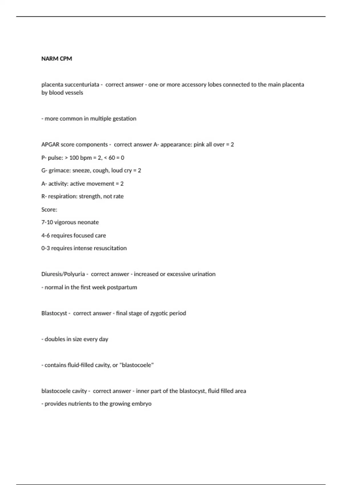 placenta succenturiata - correct answer - one or more accessory lobes connected to the main placenta by blood vessels - more common in multiple gestation APGAR score components - correct answer A- appearance: pink all over = 2 P- pulse: 100 bpm = 2, 60 = 0 G- grimace: sneeze, cough, loud cry = 2 A- activity: active movement = 2 R- respiration: strength, not rate Score: 7-10 vigorous neonate 4-6 requires focused care 0-3 requires intense resuscitation Diuresis/Polyuria - correct answer - increased or excessive urination - normal in the first week postpartum Blastocyst - correct answer - final stage of zygotic period - doubles in size every day - contains fluid-filled cavity, or "blastocoele" blastocoele cavity - correct answer - inner part of the blastocyst, fluid filled area - provides nutrients to the growing embryo
