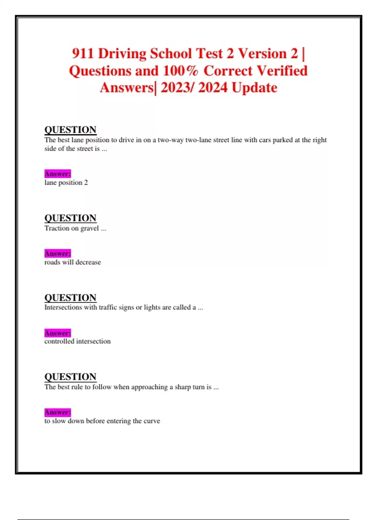 911 Driving School Test 2 Version 2 | Questions and 100% Correct Verified Answers| 2023/ 2024 Update QUESTION The best lane position to drive in on a two-way two-lane street line with cars parked at the right side of the street is ... Answer: lane position 2 QUESTION Traction on gravel ... Answer: roads will decrease QUESTION Intersections with traffic signs or lights are called a ... Answer: controlled intersection QUESTION The best rule to follow when approaching a sharp turn is ... Answer: to slow down before entering the curve QUESTION You should not ... Answer: apply brakes in the middle of a turn QUESTION When approaching the top of a hill on a two-lane road you should ... Answer: use lane position 3 QUESTION It is never okay to stop ... Answer: on railroad tracks QUESTION The least important aspect of watching for trains is ... Answer: the length of the train QUESTION Maintaining a space cushion is a way ... Answer: of driving defensively