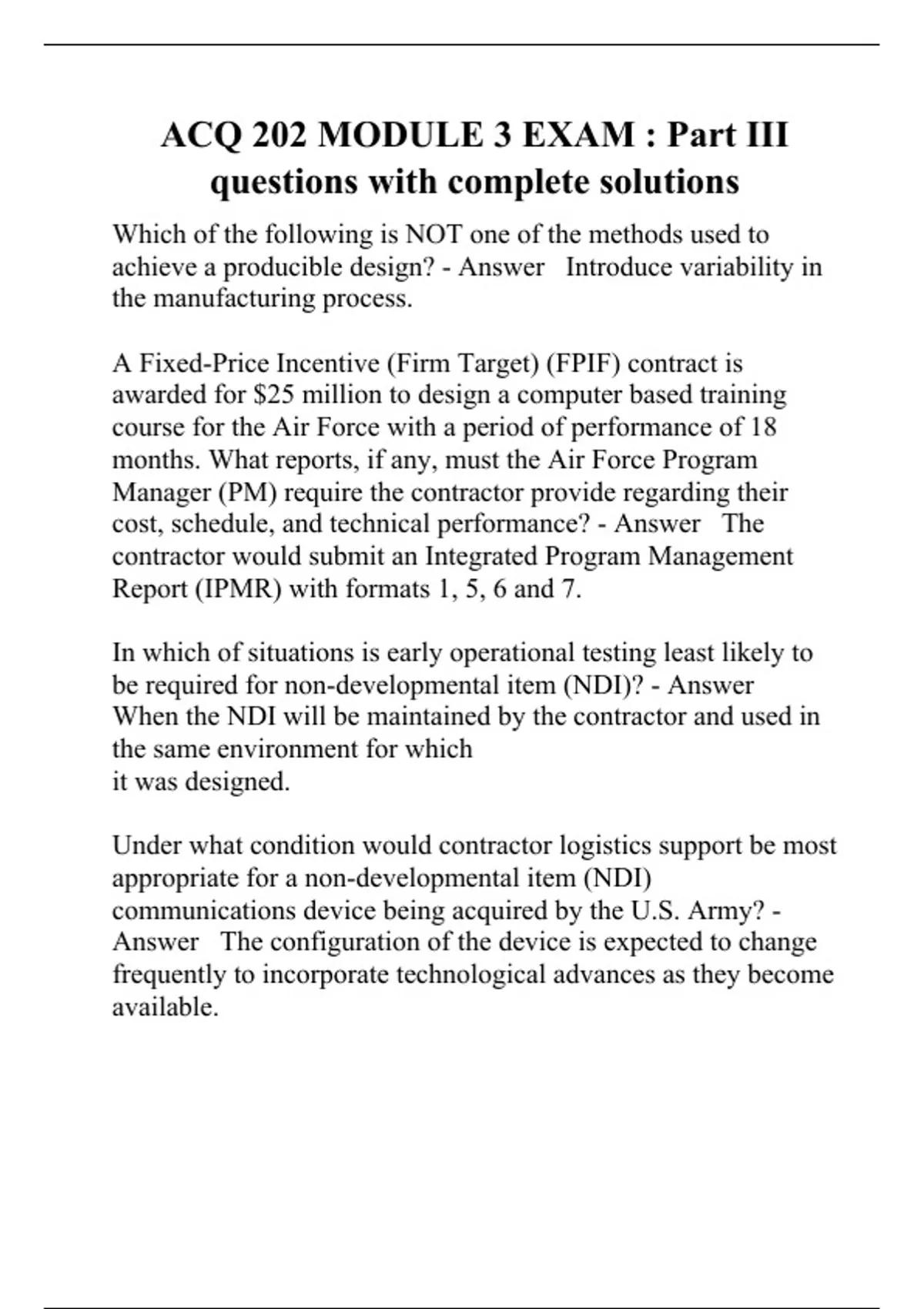 Which of the following is NOT one of the methods used to achieve a producible design? - Answer Introduce variability in the manufacturing process. A Fixed-Price Incentive (Firm Target) (FPIF) contract is awarded for $25 million to design a computer based training course for the Air Force with a period of performance of 18 months. What reports, if any, must the Air Force Program Manager (PM) require the contractor provide regarding their cost, schedule, and technical performance? - Answer The contractor would submit an Integrated Program Management Report (IPMR) with formats 1, 5, 6 and 7. In which of situations is early operational testing least likely to be required for non-developmental item (NDI)? - Answer When the NDI will be maintained by the contractor and used in the same environment for which it was designed. Under what condition would contractor logistics support be most appropriate for a non-developmental item (NDI) communications device being acquired by the U.S. Army? - Answer The configuration of the device is expected to change frequently to incorporate technological advances as they become available. Earned Value Management provides a sound basis for (select all the apply): - Answer 1. Estimating probable completion times and costs 2. Taking corrective action.