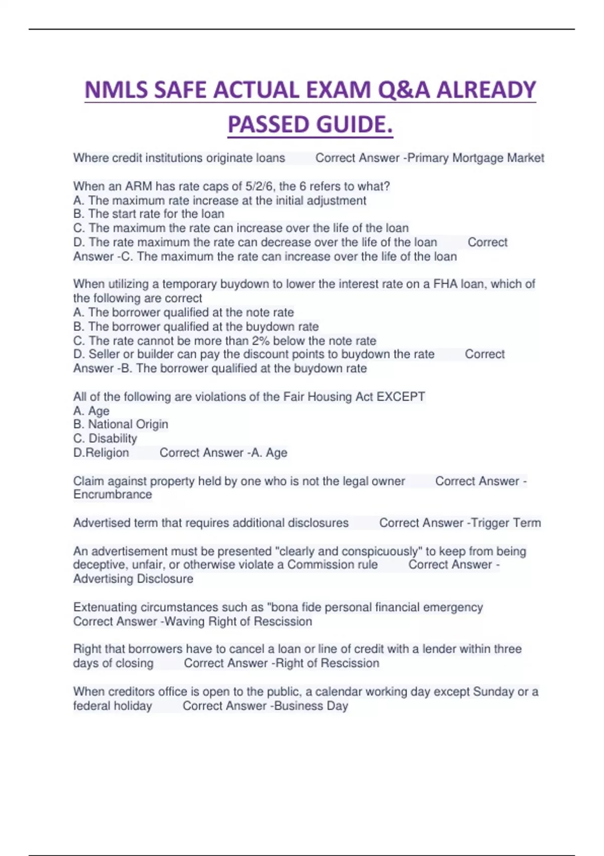 NMLS SAFE ACTUAL EXAM Q&A ALREADY PASSED GUIDE.