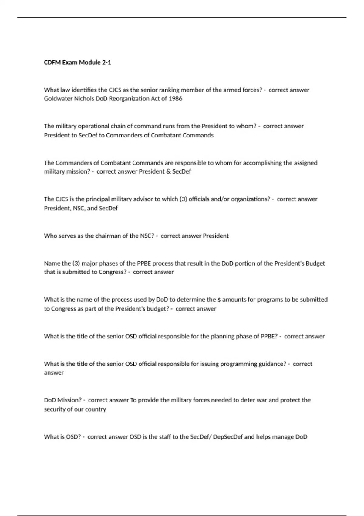 What law identifies the CJCS as the senior ranking member of the armed forces? - correct answer Goldwater Nichols DoD Reorganization Act of 1986 The military operational chain of command runs from the President to whom? - correct answer President to SecDef to Commanders of Combatant Commands The Commanders of Combatant Commands are responsible to whom for accomplishing the assigned military mission? - correct answer President & SecDef The CJCS is the principal military advisor to which (3) officials and/or organizations? - correct answer President, NSC, and SecDef Who serves as the chairman of the NSC? - correct answer President Name the (3) major phases of the PPBE process that result in the DoD portion of the President's Budget that is submitted to Congress? - correct answer What is the name of the process used by DoD to determine the $ amounts for programs to be submitted to Congress as part of the President's budget? - correct answer What is the title of the senior OSD official responsible for the planning phase of PPBE? - correct answer What is the title of the senior OSD official responsible for issuing programming guidance? - correct answer DoD Mission? - correct answer To provide the military forces needed to deter war and protect the security of our country What is OSD? - correct answer OSD is the staff to the SecDef/ DepSecDef and helps manage DoD
