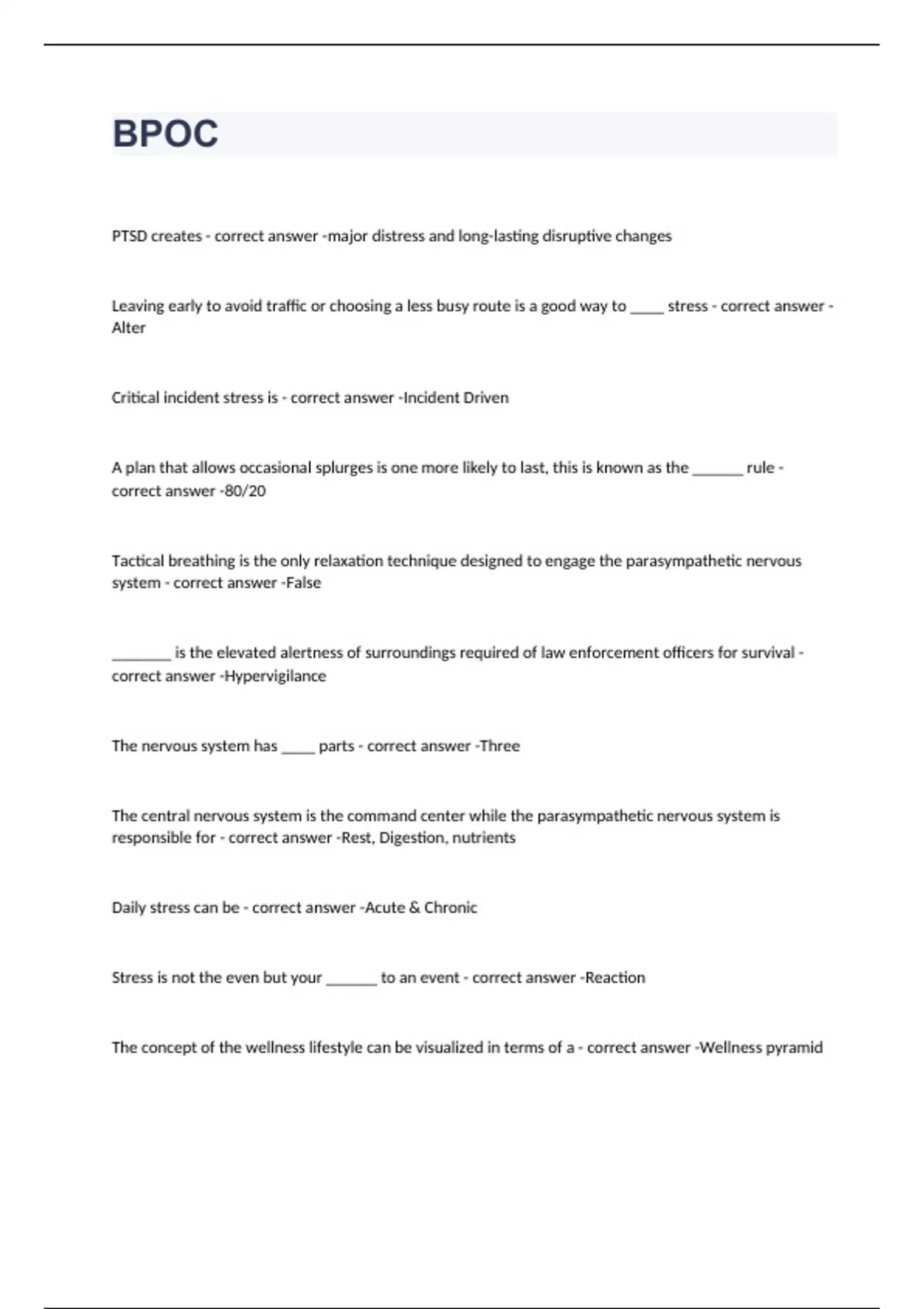 PTSD creates major distress and long-lasting disruptive changes Leaving early to avoid traffic or choosing a less busy route is a good way to ____ stress Alter Critical incident stress is Incident Driven A plan that allows occasional splurges is one more likely to last, this is known as the ______ rule 80/20 Tactical breathing is the only relaxation technique designed to engage the parasympathetic nervous system False _______ is the elevated alertness of surroundings required of law enforcement officers for survival Hypervigilance The nervous system has ____ parts Three The central nervous system is the command center while the parasympathetic nervous system is responsible for Rest, Digestion, nutrients Daily stress can be Acute & Chronic Stress is not the even but your ______ to an event Reaction The concept of the wellness lifestyle can be visualized in terms of a Wellness pyramid Non-fuel nutrients include vitamins, waters and Minerals Some common stressors of peace officers include All of the Above FITT stands for Frequency, Intensity, Time and Type A person's health/disease status and risk potential ranges on a continuum from death to optimal well-being. It is not just the absence of disease, but is a state of positive well-being is ones Wellness