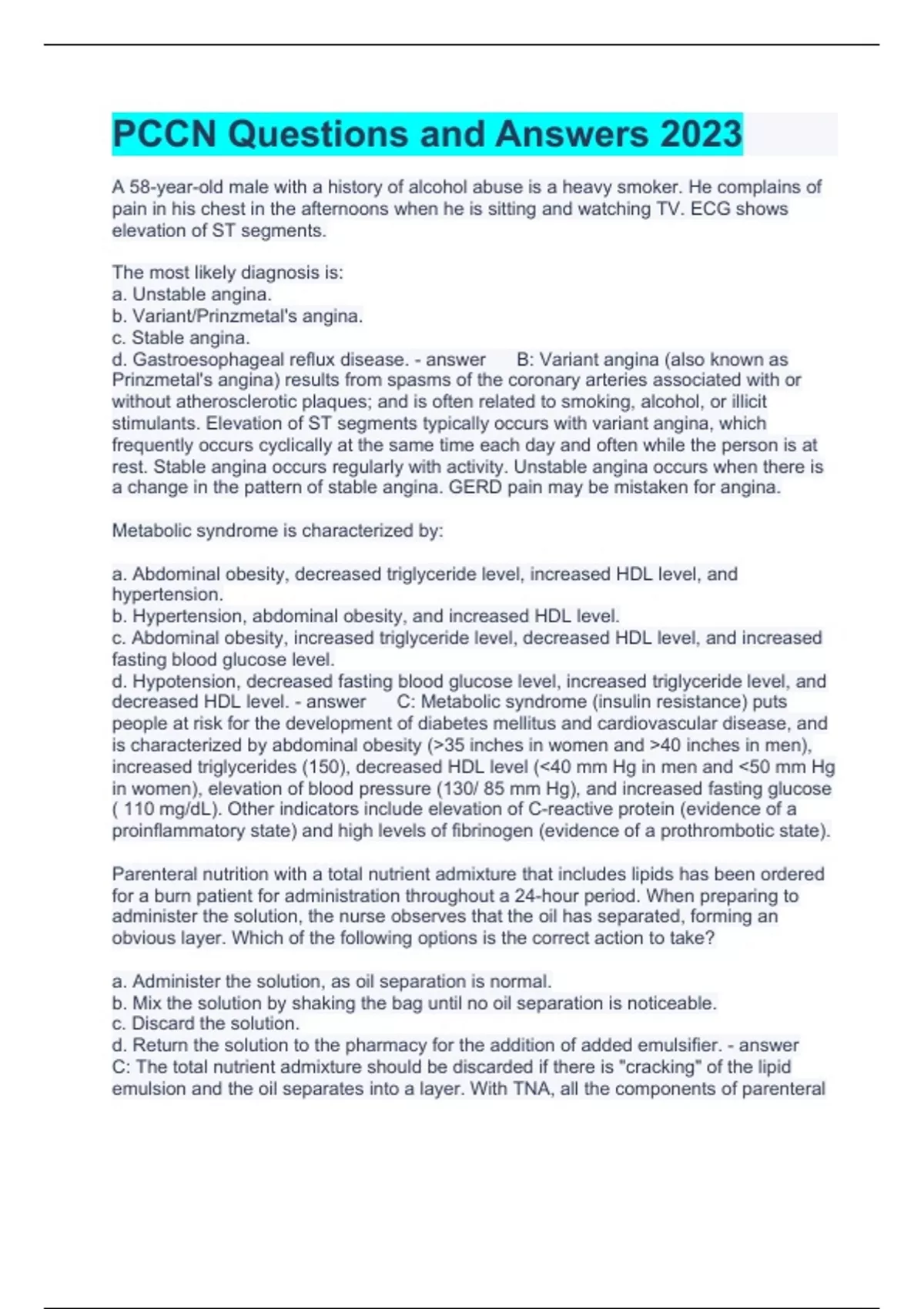 PCCN Questions and Answers 2023 A 58-year-old male with a history of alcohol abuse is a heavy smoker. He complains of pain in his chest in the afternoons when he is sitting and watching TV. ECG shows elevation of ST segments. The most likely diagnosis is: a. Unstable angina. b. Variant/Prinzmetal's angina. c. Stable angina. d. Gastroesophageal reflux disease. B: Variant angina (also known as Prinzmetal's angina) results from spasms of the coronary arteries associated with or without atherosclerotic plaques; and is often related to smoking, alcohol, or illicit stimulants. Elevation of ST segments typically occurs with variant angina, which frequently occurs cyclically at the same time each day and often while the person is at rest. Stable angina occurs regularly with activity. Unstable angina occurs when there is a change in the pattern of stable angina. GERD pain may be mistaken for angina. Metabolic syndrome is characterized by: a. Abdominal obesity, decreased triglyceride level, increased HDL level, and hypertension. b. Hypertension, abdominal obesity, and increased HDL level. c. Abdominal obesity, increased triglyceride level, decreased HDL level, and increased fasting blood glucose level. d. Hypotension, decreased fasting blood glucose level, increased triglyceride level, and decreased HDL level. C: Metabolic syndrome (insulin resistance) puts people at risk for the development of diabetes mellitus and cardiovascular disease, and is characterized by abdominal obesity (35 inches in women and 40 inches in men), increased triglycerides (150), decreased HDL level (40 mm Hg in men and 50 mm Hg in women), elevation of blood pressure (130/ 85 mm Hg), and increased fasting glucose ( 110 mg/dL). Other indicators include elevation of C-reactive protein (evidence of a proinflammatory state) and high levels of fibrinogen (evidence of a prothrombotic state). Parenteral nutrition with a total nutrient admixture that includes lipids has been ordered for a burn patient for administration throughout a 24-hour period. When preparing to administer the solution, the nurse observes that the oil has separated, forming an obvious layer. Which of the following options is the correct action to take? a. Administer the solution, as oil separation is normal. b. Mix the solution by shaking the bag until no oil separation is noticeable. c. Discard the solution. d. Return the solution to the pharmacy for the addition of added emulsifier. C: The total nutrient admixture should be discarded if there is "cracking" of the lipid emulsion and the oil separates into a layer. With TNA, all the components of parenteral nutrition and lipids are admixed together in one container to create a 3-in-1 formula. Components of parenteral nutrition generally include proteins, carbohydrates, fats, electrolytes, vitamins, sterile water, and trace vitamins. While most postoperative patients need 1500 calories per day to prevent protein breakdown, those with fever, burns, major surgery, trauma, or hypermetabolic disease may need up to 10,000 more calories daily. A 30-year-old patient complains of post-operative pain at 8 on a 1-to-10 scale 12 hours after surgery, but is not moaning, grimacing, or exhibiting any standard physical signs of pain. The patient last received pain medication 6 hours earlier, and has orders for morphine every 4 hours as needed and ibuprofen every 6 hours as needed. Which is the most appropriate action? a. Administer ibuprofen. b. Administer morphine. c. Administer ibuprofen, and if the patient does not feel relief after one hour post-dose, then administer morphine. d. Question present family members about the patient's pain tolerance before making a decision. B: The nurse should give morphine, as 8 on a 1 to 10 scale is representative of severe pain, not uncommon in the first 24 hours after surgery. Patients have a right to pain control, and the nurse should trust that the pain is what the patient says it is. Patients may show very different behavior when they are in pain. Some may cry and moan with minor pain, and others may exhibit little difference in behavior when truly suffering. Thus, judging pain by behavior can lead to the wrong conclusions. Questioning family members is not appropriate. Q-wave myocardial infarction is characterized by: a. ST-T wave changes with ST depression that reverses within a few days. b. Small infarct size-due to spontaneous reperfusion. c. Peak CK levels in 12 to 13 hours. d. Complete coronary occlusion in 80% to 90% of patients. D: Q-wave myocardial infarction is characterized by complete coronary occlusion in 80% to 90% of patients. Abnormal Q waves (wider and deeper) are especially common in the morning. Infarction is usually prolonged, resulting in transmural necrosis. Peak CK levels occur in approximately 27 hours. Non-Q-wave myocardial infarction is characterized by ST changes with ST depression. Infarct is typically non-transmural and small with coronary occlusion in only 20% to 30% of patients. Peak CK levels occur in approximately 12 to 13 hours. A nursing team leader delegates a task to an unlicensed assistive member of the personnel. Who is responsible for patient outcomes? a. The unlicensed person who completes the task b. Both the team leader and the unlicensed person who completes the task c. The team leader who delegates the task d. The administrative staff C: The nurse who delegates remains accountable for patient outcomes and for supervision of the person to whom the task was delegated. The scope of nursing includes delegation of tasks to unlicensed assistive personnel, providing those personnel have adequate training and knowledge. Delegation can be used to manage the workload and to provide adequate and safe care. Delegation should be done in a manner that reduces liability by providing adequate communication. A patient with acute lung injury has crackling, tachypnea, and cyanosis. Oxygen therapy is instituted to maintain oxygen saturation at: a. 85% b. 90% c.