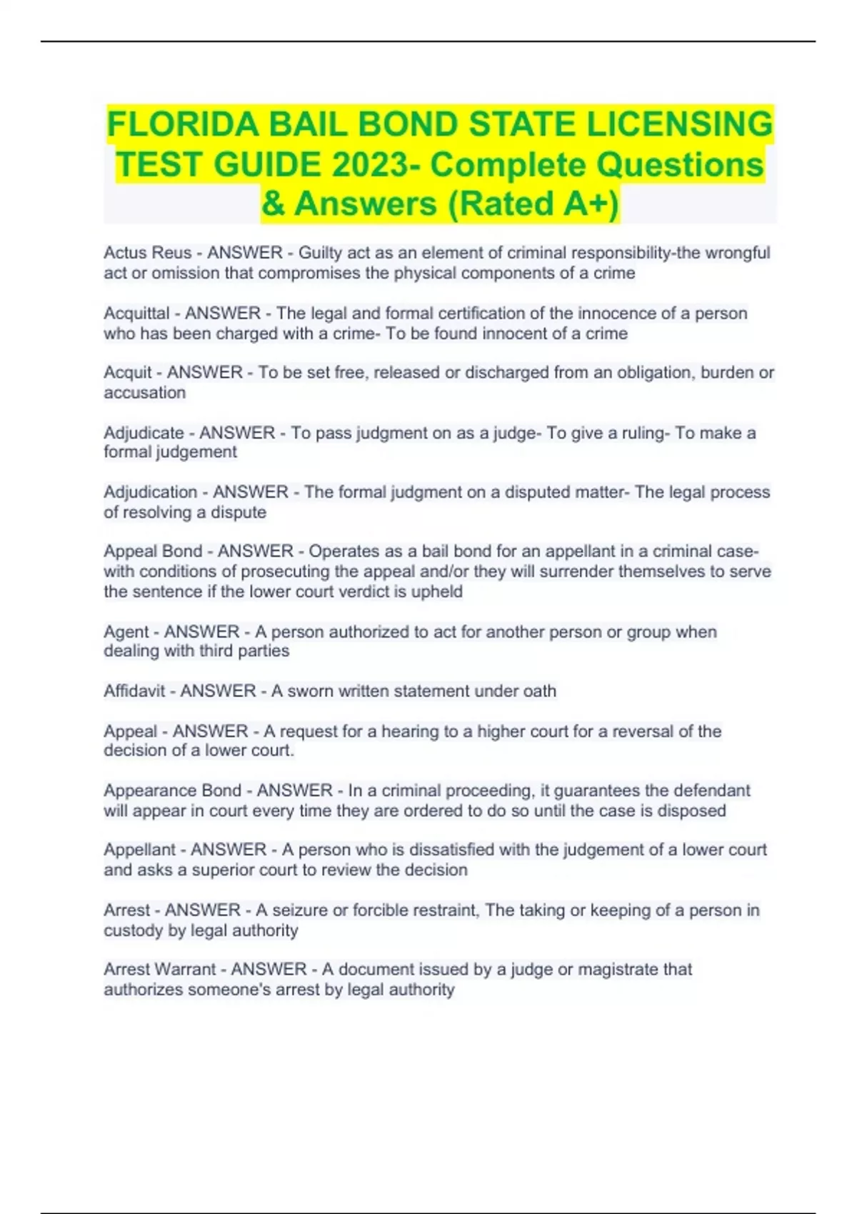 FLORIDA BAIL BOND STATE LICENSING TEST GUIDE 2023- Complete Questions & Answers (Rated A+) FLORIDA BAIL BOND STATE LICENSING TEST GUIDE 2023- Complete Questions & Answers (Rated A+) Actus Reus - ANSWER - Guilty act as an element of criminal responsibility-the wrongful act or omission that compromises the physical components of a crime Acquittal - ANSWER - The legal and formal certification of the innocence of a person who has been charged with a crime- To be found innocent of a crime Acquit - ANSWER - To be set free, released or discharged from an obligation, burden or accusation Adjudicate - ANSWER - To pass judgment on as a judge- To give a ruling- To make a formal judgement Adjudication - ANSWER - The formal judgment on a disputed matter- The legal process of resolving a dispute Appeal Bond - ANSWER - Operates as a bail bond for an appellant in a criminal case- with conditions of prosecuting the appeal and/or they will surrender themselves to serve the sentence if the lower court verdict is upheld Agent - ANSWER - A person authorized to act for another person or group when dealing with third parties Affidavit - ANSWER - A sworn written statement under oath Appeal - ANSWER - A request for a hearing to a higher court for a reversal of the decision of a lower court. Appearance Bond - ANSWER - In a criminal proceeding, it guarantees the defendant will appear in court every time they are ordered to do so until the case is disposed Appellant - ANSWER - A person who is dissatisfied with the judgement of a lower court and asks a superior court to review the decision Arrest - ANSWER - A seizure or forcible restraint, The taking or keeping of a person in custody by legal authority Arrest Warrant - ANSWER - A document issued by a judge or magistrate that authorizes someone's arrest by legal authority