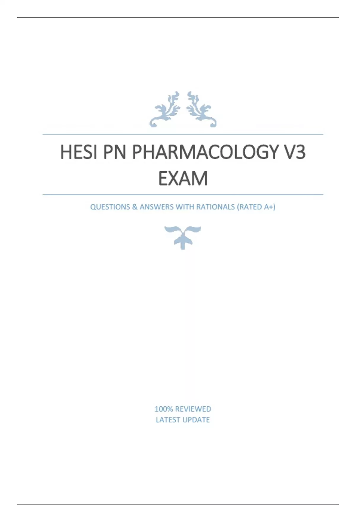 HESI PN PHARMACOLOGY V3 EXAM QUESTIONS & ANSWERS WITH RATIONALS (RATED A+) 100% REVIEWED LATEST UPDATE A client with mild parkinsonism is started on oral amantadine (Symmetrel). What statement accurately describes the action of this medication? dopamine in central nervous system is increased A 52-year-old client is admitted to the hospital for possible duodenal ulcers. The healthcare provider prescribes ranitidine hydrochloride (Zantac) 150 mg BID PO. Which data would indicate that this medication is effective? Within 4 hours after meals, the client denies having pain. A 78-year-old client with congestive heart failure receives the cardiac glycoside digoxin (Lanoxin) 0.25 mg PO daily. Which observation by the nurse indicates that the medication has been effective? Clear breath sounds anteriorly and posteriorly Minocycline (Minocin) 50 mg every 8 hours is prescribed for an adolescent girl diagnosed with acne. The nurse discusses self-care with the client while she is taking the medication. Which teaching points should be included in the discussion? (Select all that apply.) Report vaginal itching or discharge. Protect skin from natural and artificial ultraviolet light. Avoid driving until response to medication is known. Use a nonhormonal method of contraception if sexually active. The nurse is assessing a stuporous client in the emergency department who is suspected of overdosing with opioids. Which agent should the nurse prepare to administer if the client becomes comatose? Naloxone hydrochloride (Narcan) The healthcare provider prescribes captopril (Capoten) 37.5 mg. The medication is available in 25 mg tablets. What should the nurse administer? 1 ½ tablets A client who is HIV positive is receiving epoetin (Epogen) for management of anemia secondary to zidovudine (AZT) therapy. Which laboratory finding is most important for the nurse to report to the healthcare provider? Hematocrit (HCT) of 58% A 75-year-old male client taking hydrochlorothiazide (HCTZ) is admitted to the hospital having "palpitations" and "skipped heart beats." What is the most likely cause of these symptoms given the client's medication history? Hypokalemia Which parameter is most important for the nurse to check prior to administering a subcutaneous injection of heparin? A. Heart rate B. Urinary output C. Activated partial thromboplastin time (aPTT) D. Prothrombin time (PT) and international normalized ratio (INR) C. Activated partial thromboplastin time, commonly referred to as aPTT Rationale: The laboratory value that measures heparin's therapeutic anticoagulation time is the aPTT (C). (A) should be checked before the administration of digoxin. (B) is valuable information but not a parameter measured for heparin therapy. (D) is evaluated during anticoagulation therapy using sodium warfarin (Coumadin). A client is prescribed a cholinesterase inhibitor, and a family member asks the nurse how this medication works. Which pharmacophysiologic explanation should the nurse use to describe this class of drug? Improves nerve impulse transmission In developing a nursing care plan for a 9-month-old infant with cystic fibrosis, the nurse writes a nursing diagnosis of Alteration in nutrition: less than body requirements, related to inadequate digestion of nutrients. Which intervention would best meet this child's needs? Give pancrelipase (Cotazym-S) capsule mixed with applesauce before each meal. When providing client teaching about the administration of methylphenidate (Ritalin) to the mother of a child diagnosed with attention-deficit/hyperactive disorder (ADHD), what instruction should the nurse include in the teaching plan? Offer the child the medication before eating breakfast and after eating lunch. Alteration of which laboratory finding represents achievement of a therapeutic goal for heparin administration? Partial thromboplastin time The charge nurse is reviewing the admission history and physical data for four clients newly admitted to the unit. Which client is at greatest risk for adverse reactions to medications? A. 30-year-old man with a fracture B. 7-year-old child with an ear infection C. 75-year-old woman with liver disease D. 50-year-old man with an upper respiratory tract infection A. 75-year-old woman with liver disease Rationale: Impaired hepatic metabolic pathways for drug and chemical degradation place (C) at greatest risk for adverse reactions to medications based on advancing age and liver disease. (A and D) have no predisposing factors, such as genetics, pathophysiologic dysfunction, or drug allergies, that would increase the risk for cumulative toxicity or adverse drug reactions. (B) is at risk for dose-related adverse reactions but is at less risk than (C). The healthcare provider prescribes ipratropium (Atrovent) for a client. An allergic reaction to what other medication would cause the nurse to question the prescription for Atrovent? Atropine sulfate (Atropine) 68-year-old client has been diagnosed with open-angle glaucoma. The healthcare provider prescribes pilocarpine (Isopto Carpine) eye drops. What action of this drug makes it a useful treatment for the client's condition? The outflow of aqueous humor in the eyes is increased. The nurse is preparing to apply a surface anesthetic agent for a client. Which action should the nurse implement to reduce the risk of systemic absorption? A. Apply the anesthetic to mucous membranes. B. Limit the area of application to inflamed areas. C. Avoid abraded skin areas when applying the anesthetic. D. Spread the topical agent over a large surface area. C. Avoid abraded skin areas when applying the anesthetic Rationale: To minimize systemic absorption of topical anesthetics, the anesthetic agent should be applied to the smallest surface area of intact skin (C). Application to the mucous membranes poses the greatest risk (A) of systemic absorption because absorption occurs more readily through mucous membranes than through the skin. Inflamed areas generally have