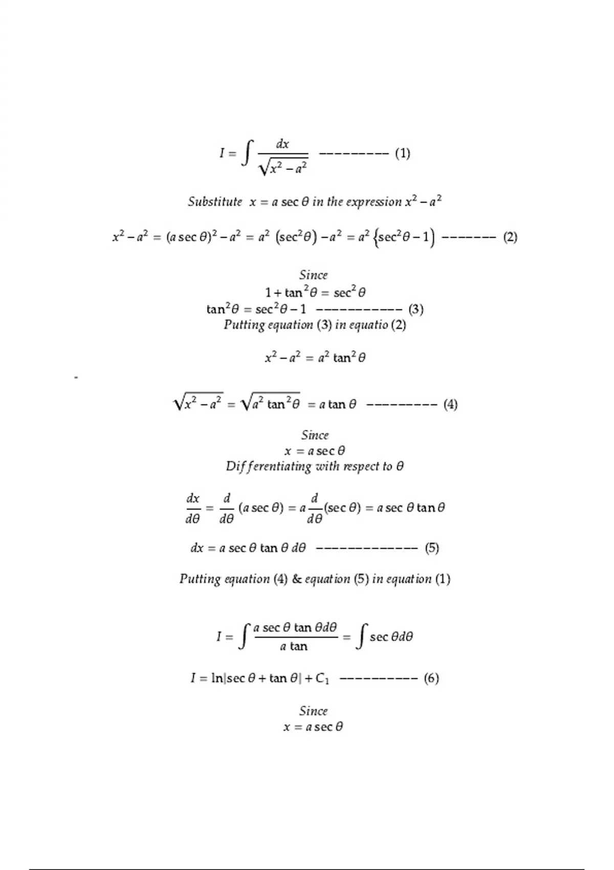 x 2 - a 2 = (a sec 𝜃) 2 - a 2 = a 2 sec 2 𝜃 - a 2 = a 2 sec 2 𝜃 - 1 ------- (2)
