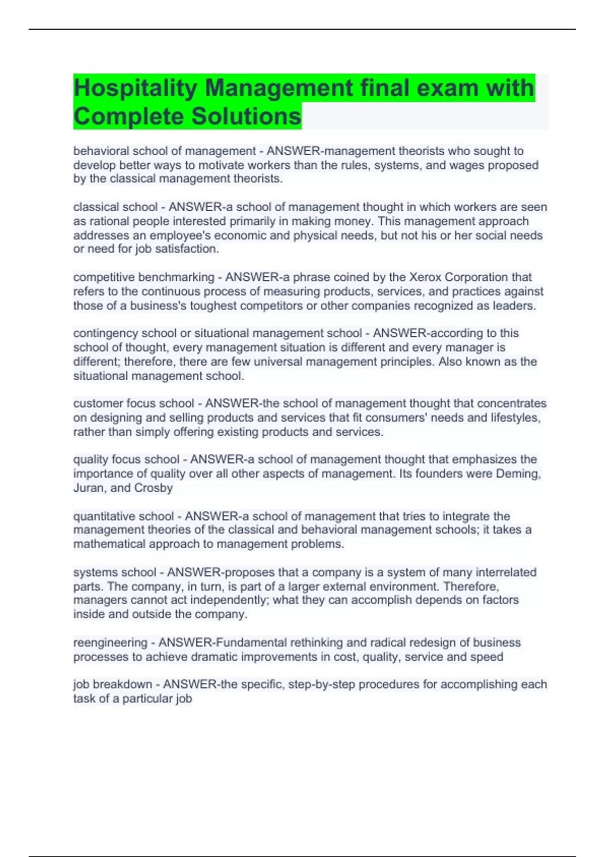 behavioral school of management - ANSWER-management theorists who sought to develop better ways to motivate workers than the rules, systems, and wages proposed by the classical management theorists. classical school - ANSWER-a school of management thought in which workers are seen as rational people interested primarily in making money. This management approach addresses an employee's economic and physical needs, but not his or her social needs or need for job satisfaction. competitive benchmarking - ANSWER-a phrase coined by the Xerox Corporation that refers to the continuous process of measuring products, services, and practices against those of a business's toughest competitors or other companies recognized as leaders. contingency school or situational management school - ANSWER-according to this school of thought, every management situation is different and every manager is different; therefore, there are few universal management principles. Also known as the situational management school. customer focus school - ANSWER-the school of management thought that concentrates on designing and selling products and services that fit consumers' needs and lifestyles, rather than simply offering existing products and services. quality focus school - ANSWER-a school of management thought that emphasizes the importance of quality over all other aspects of management. Its founders were Deming, Juran, and Crosby quantitative school - ANSWER-a school of management that tries to integrate the management theories of the classical and behavioral management schools; it takes a mathematical approach to management problems. systems school - ANSWER-proposes that a company is a system of many interrelated parts. The company, in turn, is part of a larger external environment. Therefore, managers cannot act independently; what they can accomplish depends on factors inside and outside the company. reengineering - ANSWER-Fundamental rethinking and radical redesign of business processes to achieve dramatic improvements in cost, quality, service and speed job breakdown - ANSWER-the specific, step-by-step procedures for accomplishing each task of a particular job