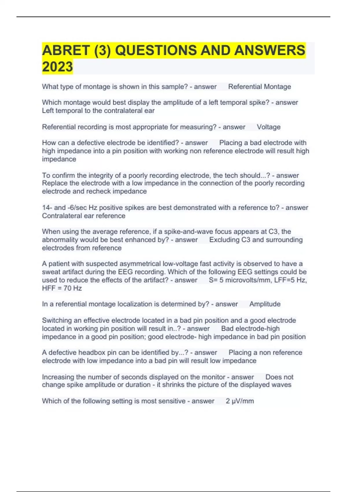 ABRET (3) QUESTIONS AND ANSWERS 2023 What type of montage is shown in this sample? Referential Montage Which montage would best display the amplitude of a left temporal spike? Left temporal to the contralateral ear Referential recording is most appropriate for measuring? Voltage How can a defective electrode be identified? Placing a bad electrode with high impedance into a pin position with working non reference electrode will result high impedance To confirm the integrity of a poorly recording electrode, the tech should...? Replace the electrode with a low impedance in the connection of the poorly recording electrode and recheck impedance 14- and -6/sec Hz positive spikes are best demonstrated with a reference to? Contralateral ear reference When using the average reference, if a spike-and-wave focus appears at C3, the abnormality would be best enhanced by? Excluding C3 and surrounding electrodes from reference A patient with suspected asymmetrical low-voltage fast activity is observed to have a sweat artifact during the EEG recording. Which of the following EEG settings could be used to reduce the effects of the artifact? S= 5 microvolts/mm, LFF=5 Hz, HFF = 70 Hz In a referential montage localization is determined by? Amplitude Switching an effective electrode located in a bad pin position and a good electrode located in working pin position will result in..? Bad electrode-high impedance in a good pin position; good electrode- high impedance in bad pin position A defective headbox pin can be identified by...? Placing a non reference electrode with low impedance into a bad pin will result low impedance Increasing the number of seconds displayed on the monitor Does not change spike amplitude or duration - it shrinks the picture of the displayed waves Which of the following setting is most sensitive 2 µV/mm A waveform of 0.5 Hz can be best enhanced with a filter of LFF of 0.3 Hz Which of the following time constants would best display delta activity? 1.0 second Time constant Low frequency filter A 0.5 Hz wave is enhanced without affecting a spike by using...? a LFF 0.3 Hz Frequency Response Curve Filters The 60 Hz notch filter will have the greatest effect on a waveform having a duration of 16mm/sec A slow wave focus is best seen with...? LFF 0.3 Hz, PPS of 15 mm/sec With high frequency filtering, muscle artifact may become distorted and look like...? Beta activity Which combination settings will help enhance a low voltage slow wave that is being masked by muscle activity? Sensitivity of 5µV; LFF of 0.3 Hz; HFF of 35 Hz Which of the following is important for the technologist to document in order to aid in interpretation? If the patient was awake and alert during the recording Sharply contoured, surface positivity, and seen in clusters over the occipital lobe during drowsiness, describes... POSTS What waveform is seen in stage 2 sleep and during arousals, and contains 3 components: sharp, slow and fast? K-complex EEG with a very tense and anxious patient shows...? Widespread low voltage activity A Glossokinetic Artifact is Biological Artifact that is caused by movement of people Electrostatic artifact The EEG activity seen maximally from the frontal leads is best described as Bifrontal myogenic artifact/Eye blink artifact What is the value of recording a patient's maximal awake state? To distinguish slowing from drowsiness Which of the following is normal activity seen in the occipital regions when a patient's eyes are scanning a detailed picture? Lambda Bancaud's phenomenon, alpha squeak and paradoxical alpha all have to do with...? a reaction of the background (PDR) A common electrographic correlate of a seizure Rhythmic activity During hyperventilation, a 9-year-old patient develops generalized 100-300 µV slowing. If, within thirty seconds post hyperventilation, the record returns to its pre-hyperventilation state, the reaction would be...? A normal response to hyperventilation