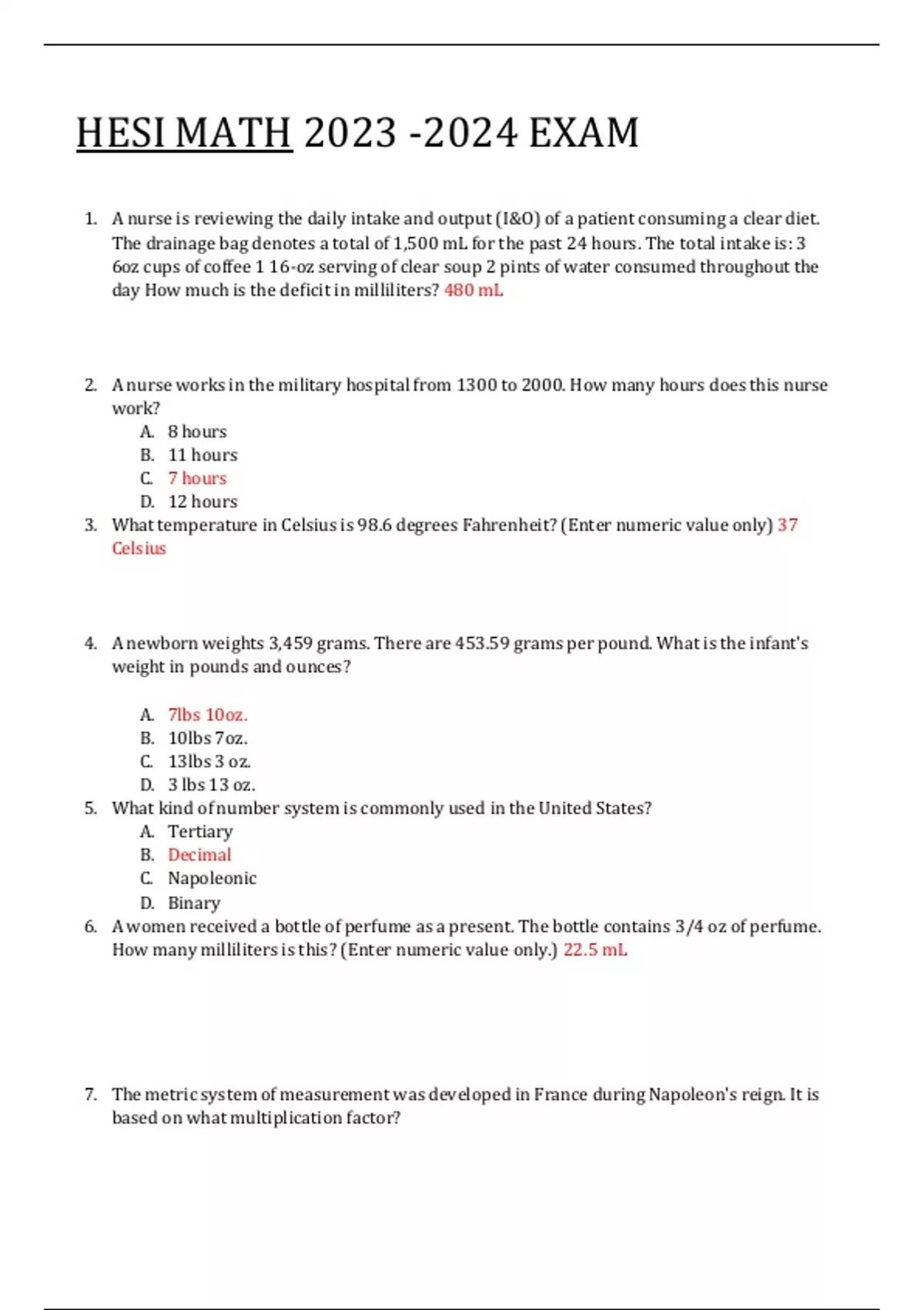 HESI MATH EXAM 1. A nurse is reviewing the daily intake and output (I&O) of a patient consuming a clear diet. The drainage bag denotes a total of 1,500 mL for the past 24 hours. The total intake is: 3 6oz cups of coffee 1 16-oz serving of clear soup 2 pints of water consumed throughout the day How much is the deficit in milliliters? 480 mL 2. A nurse works in the military hospital from 1300 to 2000. How many hours does this nurse work? A. 8 hours B. 11 hours C. 7 hours D. 12 hours 3. What temperature in Celsius is 98.6 degrees Fahrenheit? (Enter numeric value only) 37 Celsius 4. A newborn weights 3,459 grams. There are 453.59 grams per pound. What is the infant's weight in pounds and ounces? A. 7lbs 10oz. B. 10lbs 7oz. C. 13lbs 3 oz. D. 3 lbs 13 oz. 5. What kind of number system is commonly used in the United States? A. Tertiary B. Decimal C. Napoleonic D. Binary 6. A women received a bottle of perfume as a present. The bottle contains 3/4 oz of perfume. How many milliliters is this? (Enter numeric value only.) 22.5 mL 7. The metric system of measurement was developed in France during Napoleon's reign. It is based on what multiplication factor? A.The length of Napoleon’s forearm B. 2 C.10 D. Atomic weight of helium 8. How many meters are in 2 kilometers? (Enter numeric value only.) 2000 meters 1meter = 1000 kilometers 2x1000= 2000 9. How many kilograms are in 2000 grams? (Enter numeric value only.) 2 kilograms Kg g mg (move 3 times to the right or left) (L) to (s) ex: 2000=2 or 2=2000 10. To convert pounds to kilograms, what factor is used? 2.2 1 pound = 2.2 kilogram 10. A teacher's aide is preparing a snack for the class. In order to prepare the powdered drink, the aide must convert the directions to metric. The directions say, "Dilute contents of package in 3 quarts of water." The aide has a measuring device marked in liters. How many liters of water should be used? (Enter numeric value only. If rounding is required, round to the nearest tenth.) Version 2 - HESI Convert 5 3/4 to a decimal. Round to the nearest tenth. 4 x 5+ 4 = 23 5.75roundtothenearesttenth 5.8 4 4 5.75 5.7 6 5.8 A warehouse worker ships 9 boxes each day. Every box must contain 3 shipping labels. How many shipping labels does the worker need each day?9 x 3 =27 7 3 27 24 2.5:150 ::20:x= 2.5 = 20 =20 x 150=3000 ÷ 2.5=1200 150 x X=3000 X=1000 X=1500 X=1200 What is 80% of 55?.80 x 55 = 44 45 44 40 39 3.44 divided by 0.6= 3.44 ÷ 0.6=5.73 11.41 5.73 2.33 0.57 Solve if x=11. x+44/2x = 11 + 44 ÷ 2( 11)→11+44 ÷22→11+2=13 33 2.5 13 55/22 4 7/8 divided by 1 1/6= 8 x 4 +7 ÷ 6 x 1+1 → 39 ÷ 7 → 39 x 6 → 39 x 3 = 117 →117÷ 28=4 5 8 6 4& 6/8 4& 7/8 5& 8/14 4 & 5/28 8 6 8 7 4 7 28 28 Add. 6 3/4 + 8 1/6= 4 x 6 +3 + 4 6 x 8+1 → 27 + 49 → 27 x 6 + 49 x 4 → 162 + 196 → 358 →358 ÷ 24=14 22 →reduce 14 11 6 4 6 14 & 11/12 12& 3/24 35/6 14& 2/5 4 x 6 6 x 12 Solve for x. x/250=3/500 = x 250 = 3 =3 x 250=750 ÷ 500=1.5 500 1.5 25.5 1500 2.5 A dice is rolled. What is the probability of getting 5? 1= x =1 x 100=100 ÷ 6=16.6 % 6 50% 20% 100 16.6% 83.3% Convert to metric: 7 gram = x mg = (large – move decimal 3x to the right) Km →m→mm→mcm ( small) org→ L→m (small −movethedecimal 3 xtotheleft) 7 g = 7.0 move 3x to the left 7,000mg 0.007mg 7,000 mg 0.0007mg 700mg Sally eats 3/5 of her lunch. John eats 75%. Who ate more? Sally - 3 ÷ 5=0.6�John−.75 John Sally 1 + 3 → 1 x 2 + 3 → 2 3 5 Add 1/4 + 3/8. = 4 8 4/12 1/3 5/8 1/2 4 x2 8 8 + 8 = 8 How many ounces in 8 1/4 pints?1 pint = 16oz 4 x 8+1 → 33 x 16 = 4 4 528 →528 ÷ 4=132 4 128 oz 2.25 oz 132oz 136oz Subtract 5/6 - 3/4. 5 − 3 → 5 x2 − 3 x3 → 10 − 9 = 1 1 1/12 2/24 1/2 6 4 6 x2 2 1 2 4 x 3 2 x10 12 1x5 12 12 2 x 7 Add 2/3 + 1/6 + 2/5. 1/3 2/5 1 & 7/30 1 & 1/15 3 + 6 + 5 →3 x10 + 6 x 5 + 5 x6 →30 + 30 + 30 = 30 → 37÷ 30=1 30 A farmers productions statistics finds that it takes 2 chickens to produce 6 eggs in 24 hours. How manychickens will be needed to produce 24 eggs in 24 hours? 2= x → 2 x 24=48 ÷ 6=8 chickens 6 24 3 chickens 8 chickens 12 chickens 4 chickens Subtract 28 3/4 - 5 5/6. 4 x28+3 - 4 6 x 5+5 → 115 − 35 → 115 x 6− 35 x 4 → 690− 140= 550 →550 ÷ 24=22 22 reduce 22 11 6 4 6 23 & ½ 22 22 & 11/12 34 & 1/12 4 x6 6 x 12 Add 7/8 + 9/10 + 6/5 as mixed. 7 + 9 + 6 → 7 x 5 + 9 x 4 + 6 x 8 → 35 + 36 + 48= 119 →119÷ 40=2 39 8 10 5 8 x5 10x 4 5 x 40 3 & 39/40 22/23 2& 39/40 3 & 22/23 A mother changes her baby 6 times a day. How many diapers will be needed in a year?6 x 365 = 2190 2160 diapers 2100 diapers 2190 diapers 6000 diapers 8 x 2+5 − 7 → 21 7 14 7 =1 3 Subtract 2 5/8 - 7/8 and reduce. 8 1&5/8 1&1/4 1&6/8 8 8 − 8 = 8 → 4 →7÷ 4 4 1 & 3/4 A dice is rolled, what's the probability of an odd number? 1= x →1 x 3=3 ÷ 6=0.5 x100 %→50% 6 3 50% 75% 16.7% 33% 32 divided by 8/9.32 36 4&1/9 28&4/9 4 40.3 divided by 4.8. 0.84 0.084 8.4 84 ÷ 8 →32 x 9 = 288 →288÷ 8=36 9 8 8 Ratio and proportion 0.1:10::x:400 = 0.1 = x →0.1 x 400=40 ÷ 10=4 10 400 25 5 50 4 *A cake provides 24 servings. How many cakes do you need for a class of 70 and staff of 3?70+3=73 →1 cake=¿ 24 →2 cakes=48→3 cakes=72→4 cakes=96 4 2 3 5 A female ran a 24 mile course. Her first 6 miles she ran in 1 hour. The second set of 6 miles in 1.2 hours. The third set of 6 miles in 1.5 hours. The fourth set of 6 miles in 1.6 hours. How did long did it take her to complete the course?1 + 1.2 + 1.5 + 1.6 = 5.3 hours 5.3 hours 5.4 hours 4 hours 5 hours What is 54% of $789.56= .54 x 789.56 =$426.36 $426.37 $363.20 $426.36 $526.38 1/9 divided by 2/3 = 1/6 3/18 1/3 2/3 1 ÷ 2 9 3 → 1 x 9 3 → 1 2 3 x 1= 1 2 6 How many liters in 300 milliliters?L to mL move the decimal 3x to the left ( 300mL = 0.3liters) 0.3 liters 3 liters 0.03 liters 3.30 liters Ratio and proportion 18:x::10:300 = 540 16.6 180 30 Subtract 12 - 7 4/5. = 12− 7 5&1/5 4&4/5 5&4/5 4 & 1/5 Find x. 120:x::40:0.5 = 120 = 40 →120 x 0.5=60 ÷ 40=1.5 16 0.167 60 