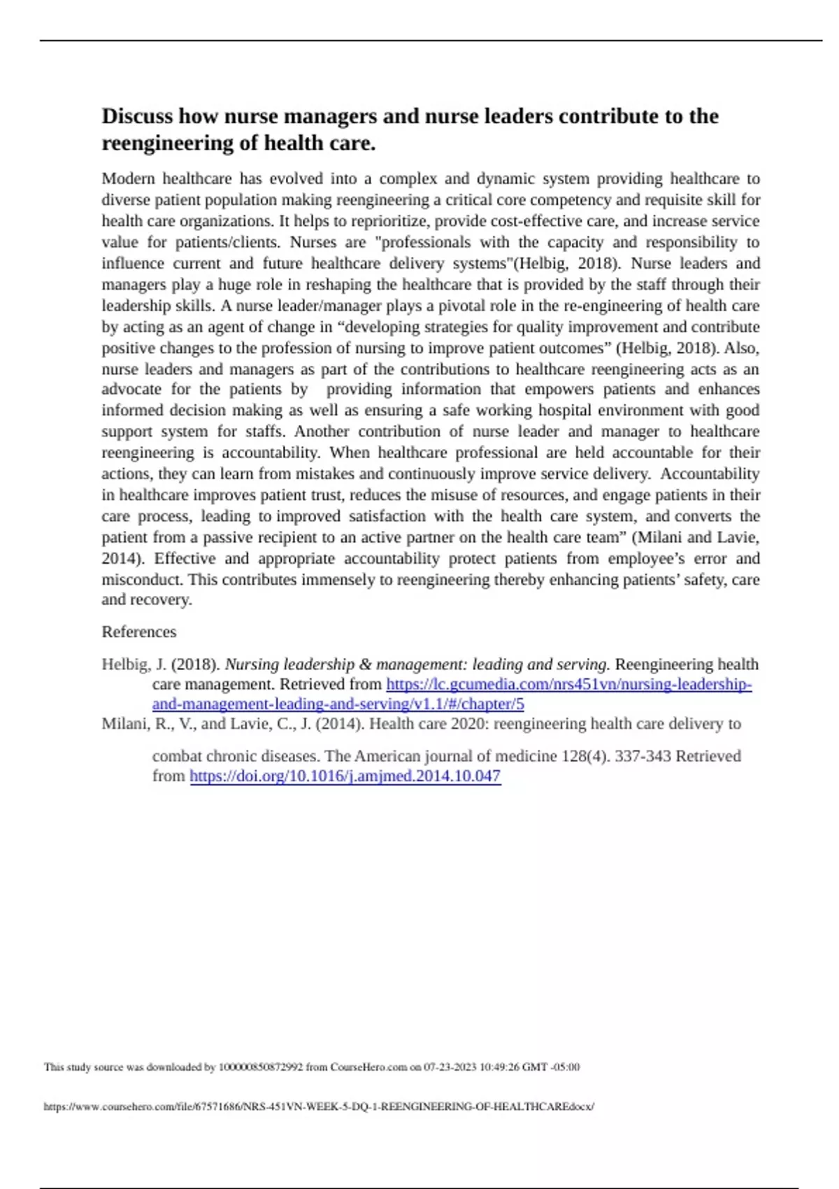 NRS 451VN WEEK 5 DQ 1 REENGINEERING OF HEALTHCARE - GRADED A+