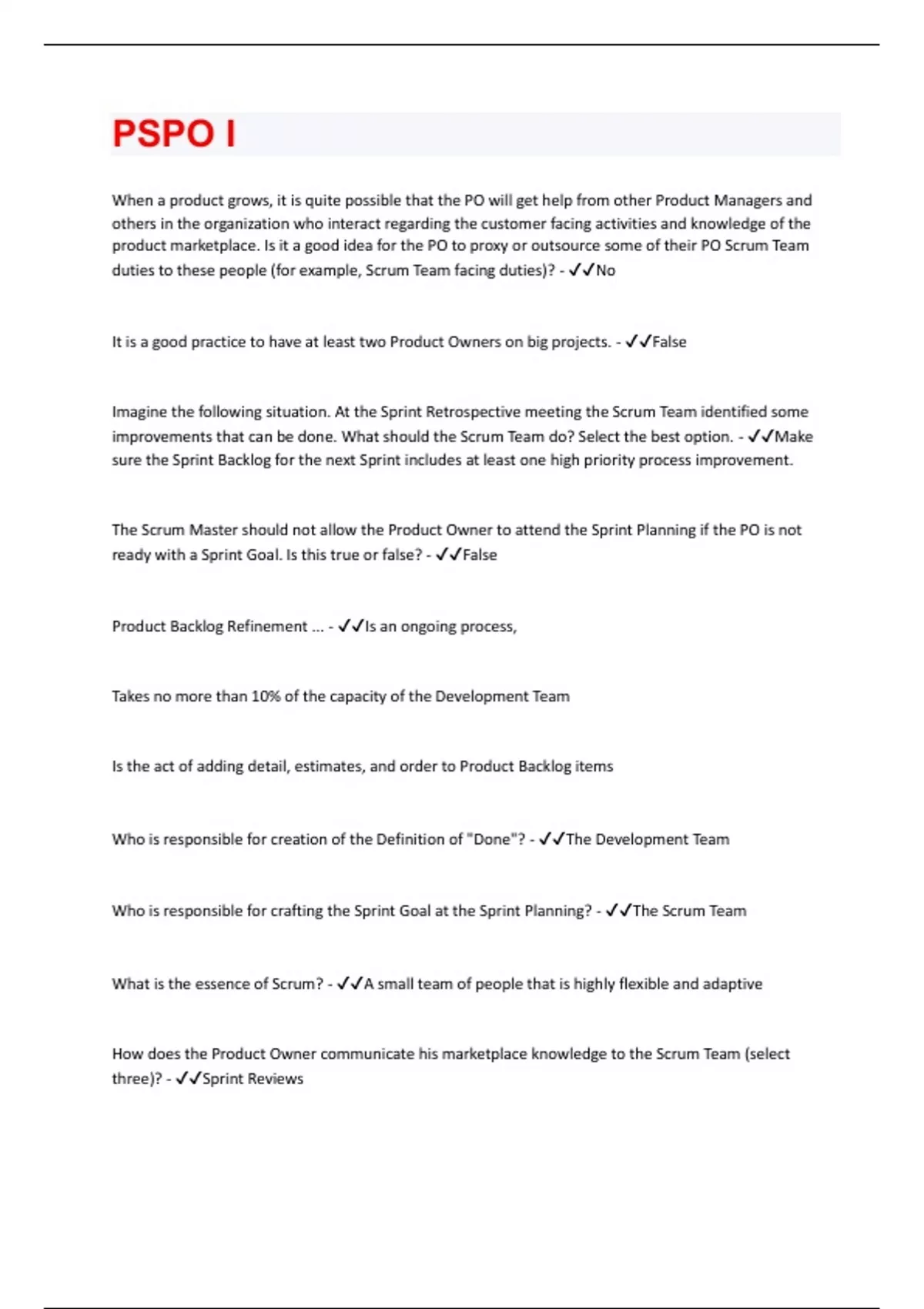 When a product grows, it is quite possible that the PO will get help from other Product Managers and others in the organization who interact regarding the customer facing activities and knowledge of the product marketplace. Is it a good idea for the PO to proxy or outsource some of their PO Scrum Team duties to these people (for example, Scrum Team facing duties)? - No It is a good practice to have at least two Product Owners on big projects. - False Imagine the following situation. At the Sprint Retrospective meeting the Scrum Team identified some improvements that can be done. What should the Scrum Team do? Select the best option. - Make sure the Sprint Backlog for the next Sprint includes at least one high priority process improvement. The Scrum Master should not allow the Product Owner to attend the Sprint Planning if the PO is not ready with a Sprint Goal. Is this true or false? - False Product Backlog Refinement ... - Is an ongoing process, Takes no more than 10% of the capacity of the Development Team Is the act of adding detail, estimates, and order to Product Backlog items Who is responsible for creation of the Definition of "Done"? - The Development Team Who is responsible for crafting the Sprint Goal at the Sprint Planning? - The Scrum Team What is the essence of Scrum? - A small team of people that is highly flexible and adaptive How does the Product Owner communicate his marketplace knowledge to the Scrum Team (select three)? - Sprint Reviews