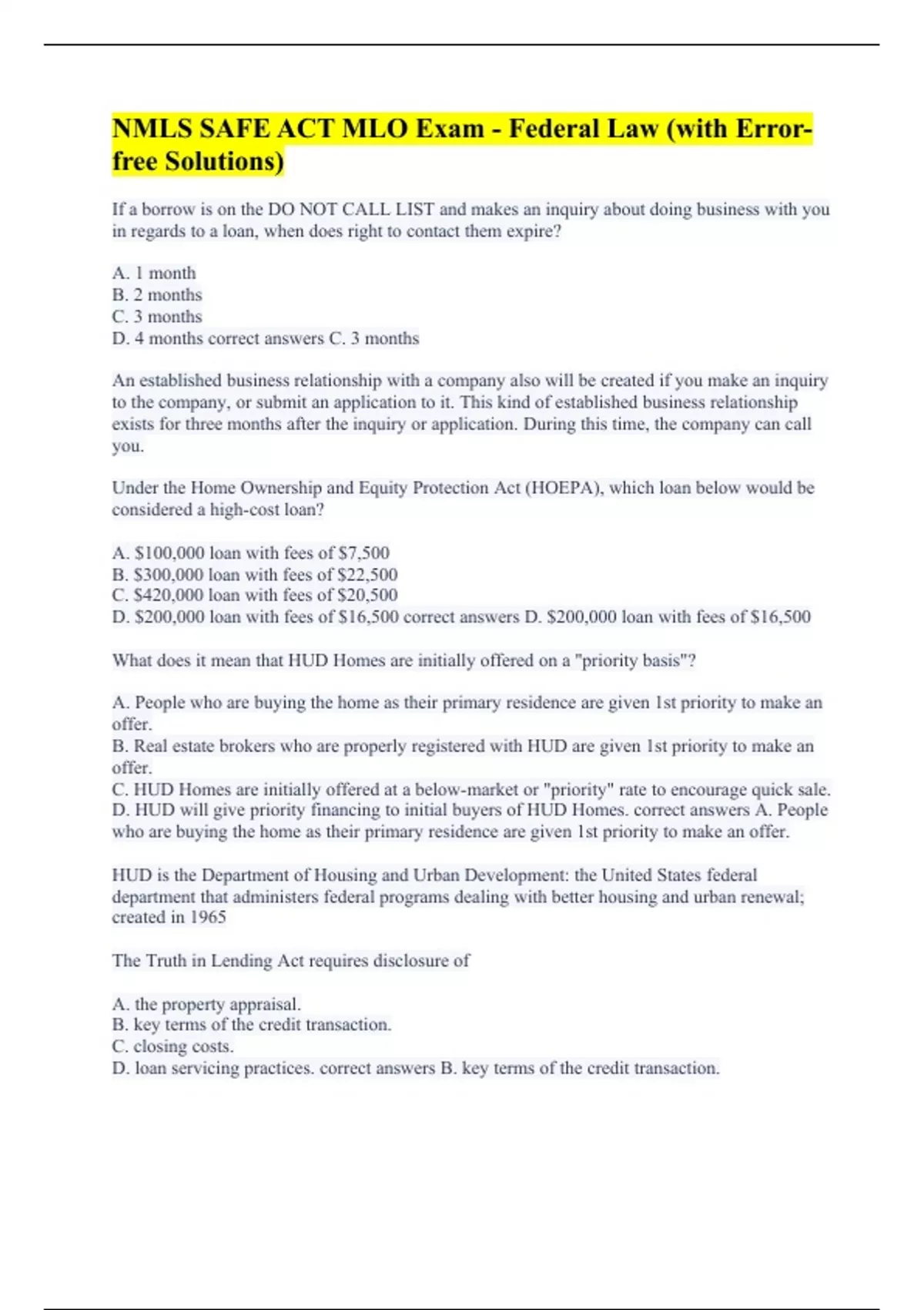 If a borrow is on the DO NOT CALL LIST and makes an inquiry about doing business with you in regards to a loan, when does right to contact them expire? A. 1 month B. 2 months C. 3 months D. 4 months correct answers C. 3 months An established business relationship with a company also will be created if you make an inquiry to the company, or submit an application to it. This kind of established business relationship exists for three months after the inquiry or application. During this time, the company can call you. Under the Home Ownership and Equity Protection Act (HOEPA), which loan below would be considered a high-cost loan? A. $100,000 loan with fees of $7,500 B. $300,000 loan with fees of $22,500 C. $420,000 loan with fees of $20,500 D. $200,000 loan with fees of $16,500 correct answers D. $200,000 loan with fees of $16,500 What does it mean that HUD Homes are initially offered on a "priority basis"? A. People who are buying the home as their primary residence are given 1st priority to make an offer. B. Real estate brokers who are properly registered with HUD are given 1st priority to make an offer. C. HUD Homes are initially offered at a below-market or "priority" rate to encourage quick sale. D. HUD will give priority financing to initial buyers of HUD Homes. correct answers A. People who are buying the home as their primary residence are given 1st priority to make an offer. HUD is the Department of Housing and Urban Development: the United States federal department that administers federal programs dealing with better housing and urban renewal; created in 1965 The Truth in Lending Act requires disclosure of A. the property appraisal. B. key terms of the credit transaction. C. closing costs. D. loan servicing practices. correct answers B. key terms of the credit transaction.
